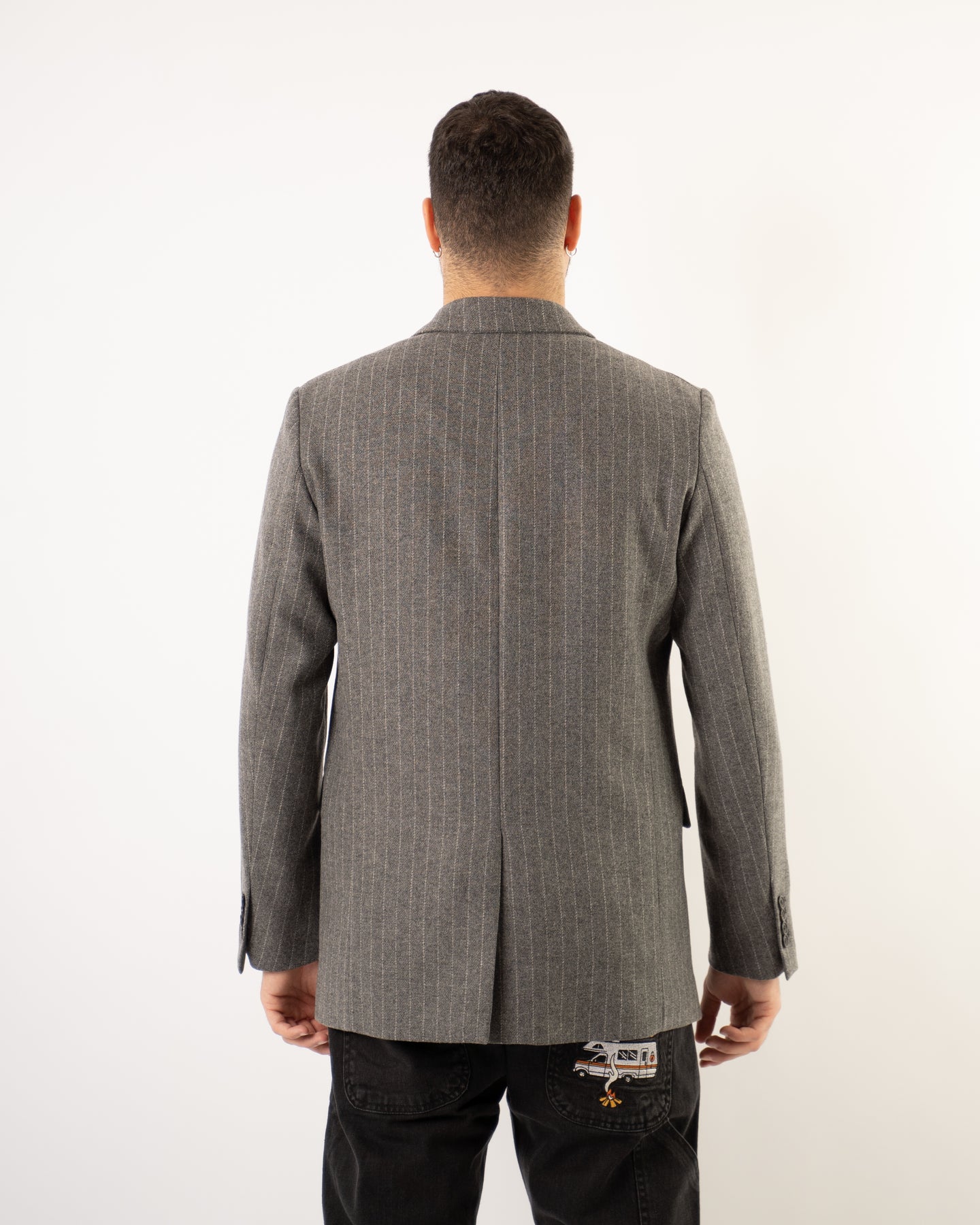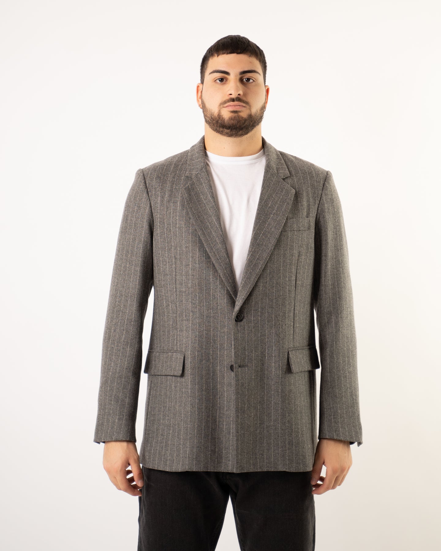 Giacca monopetto due bottoni gessata in lana vergine colore grigio.