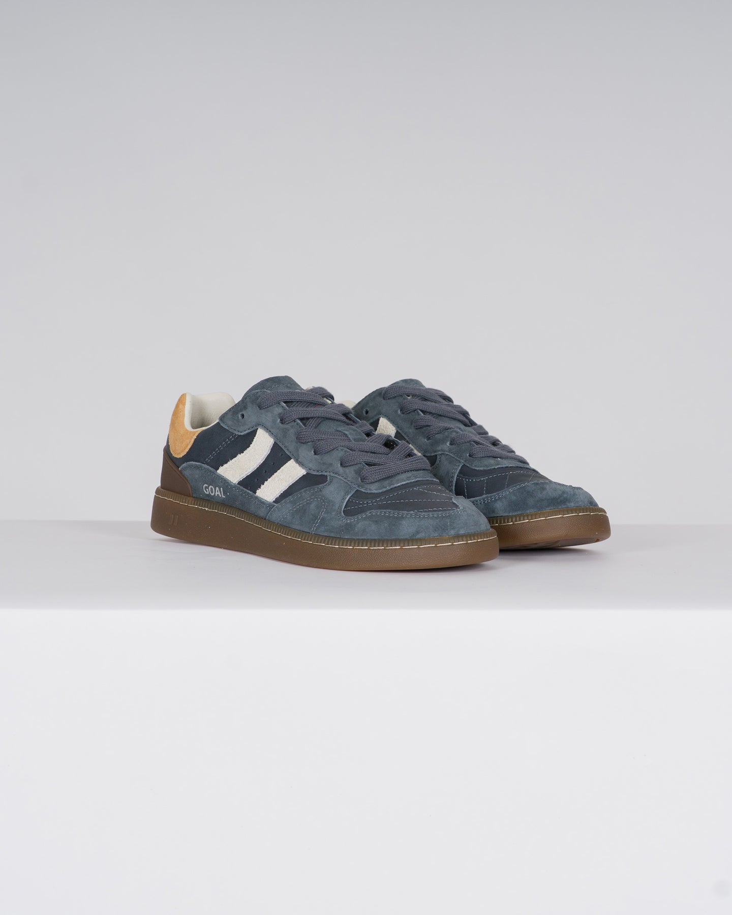 Scarpa sportiva in pelle scamosciata con dettagli a contrasto. Linguetta in pelle preformata con imbottitura sagomata. Vista della fodera in pelle. Lacci piatti intercambiabili in cotone bicolore. Colletto leggermente imbottito. La parte anteriore presenta un rinforzo con cuciture. Suola flessibile in gomma/gomma che garantisce resistenza e aderenza. Presenta il nome del modello "GOAL" sul lato in oro antico.