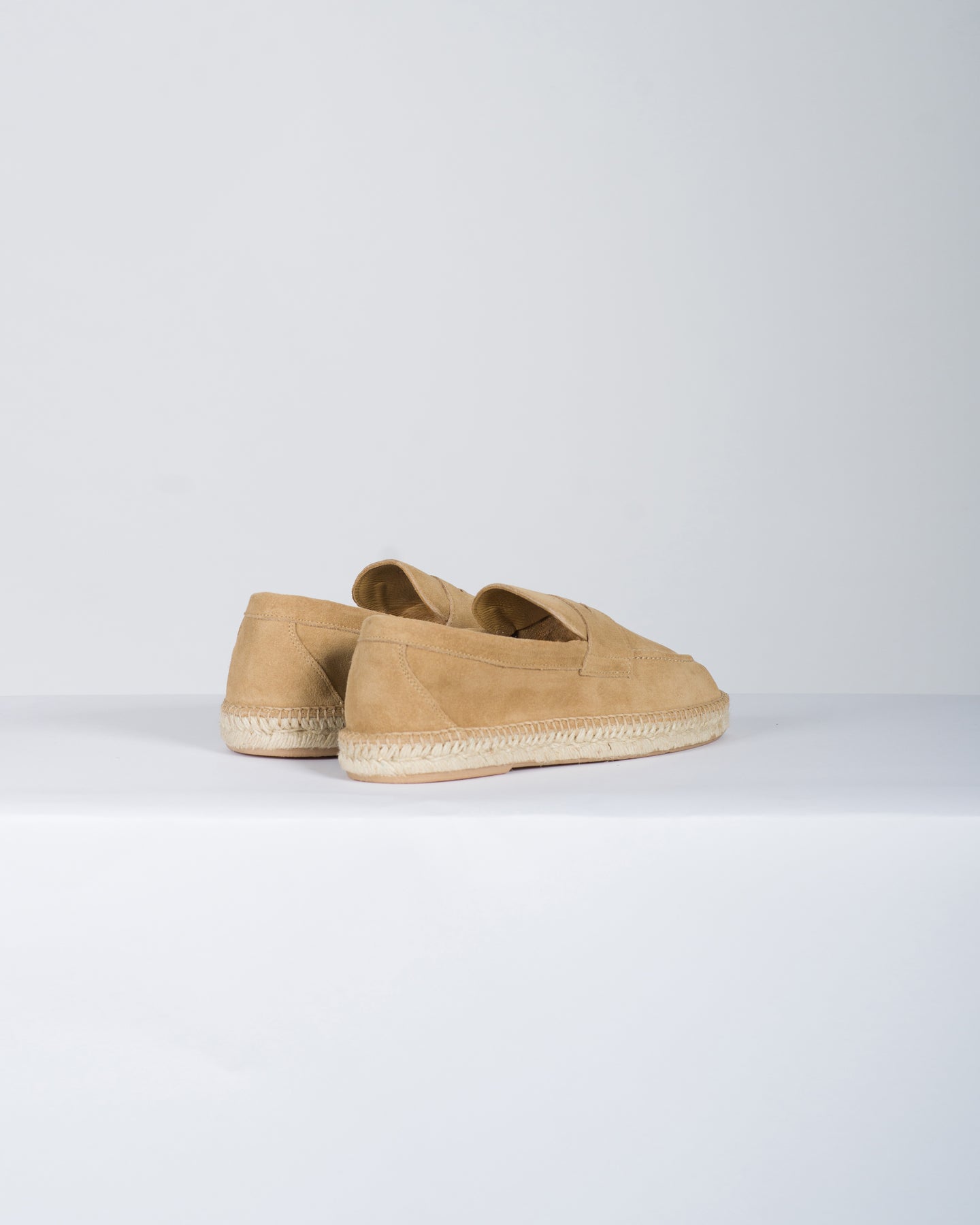 Mocassino in camoscio pietra con suola in corda naturale vulcanizzata.
