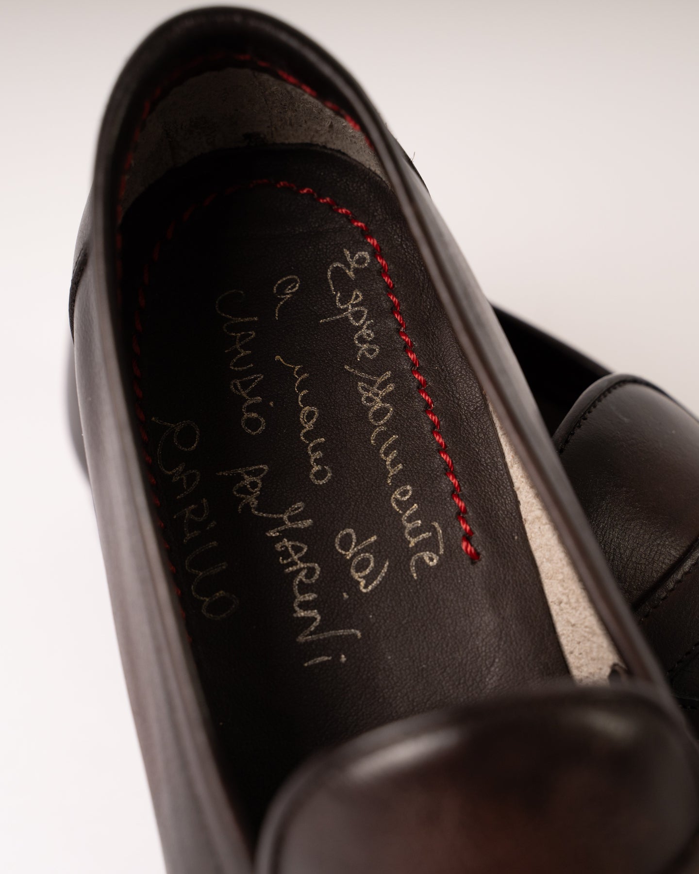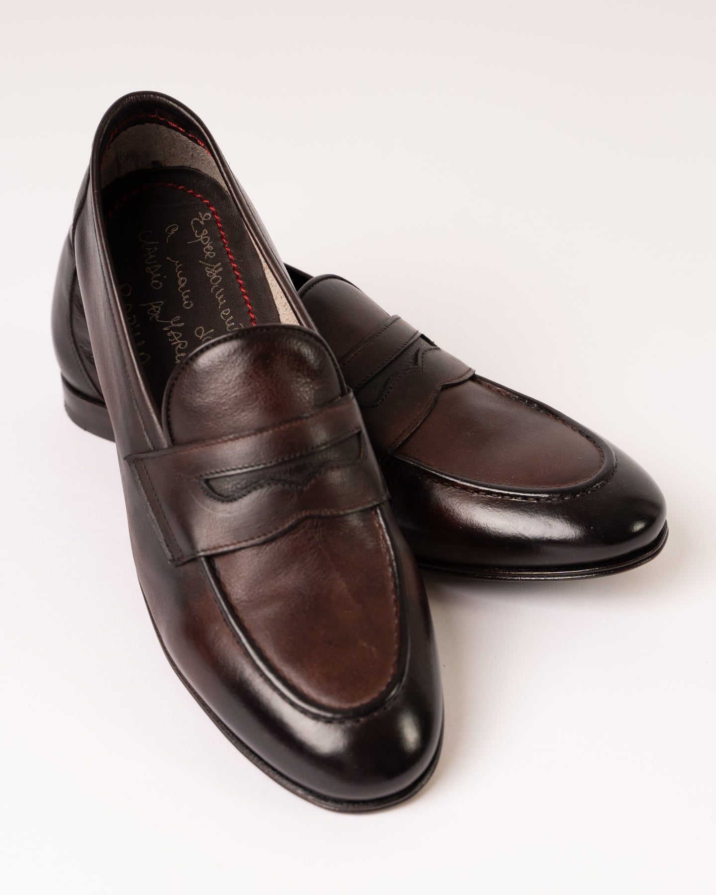 Mocassini in pelle spazzolata colore marrone con fibbia e suola in cuoio.