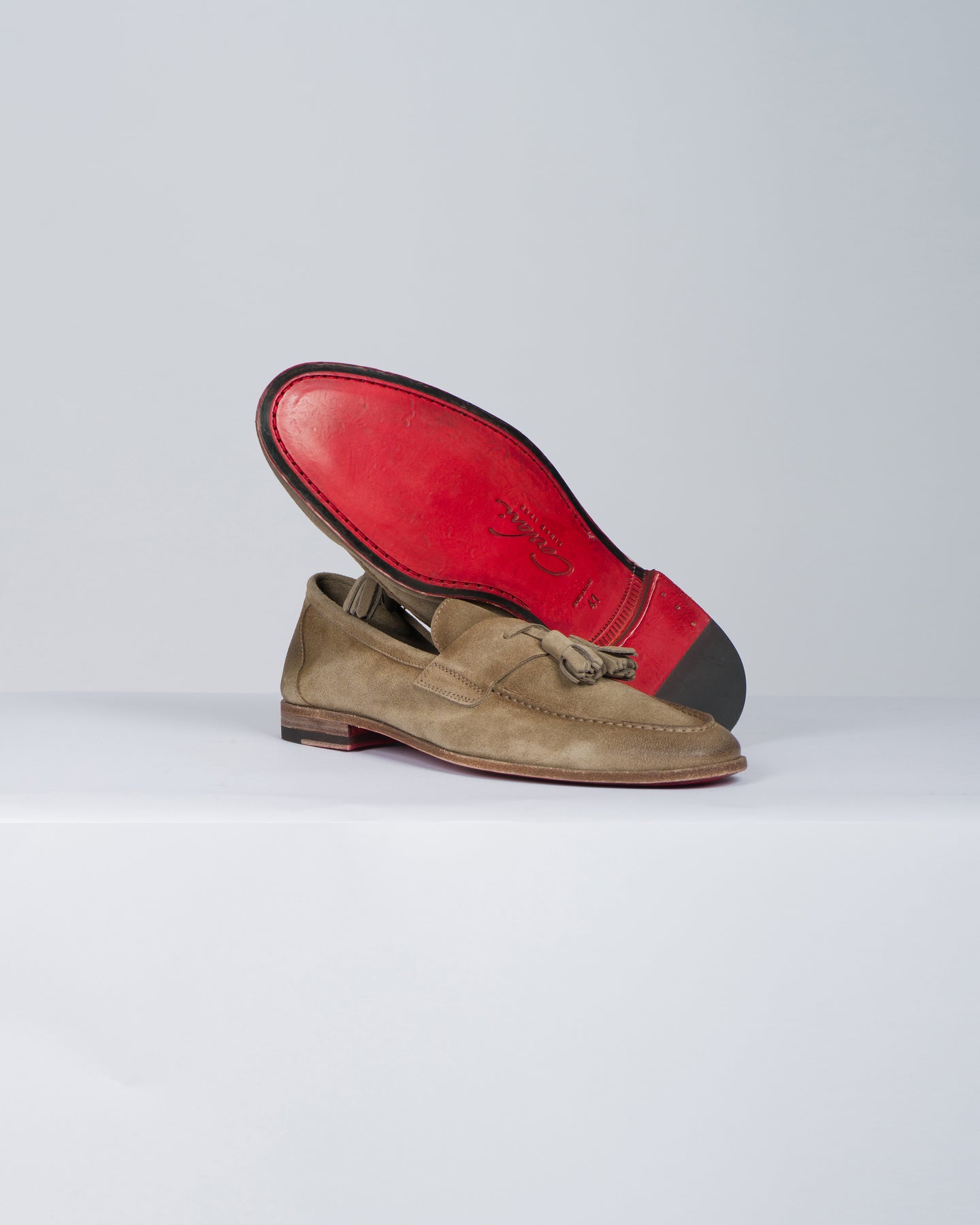 Mocassini in camoscio colore sabbia con nappine e suola ultra light in cuoio.