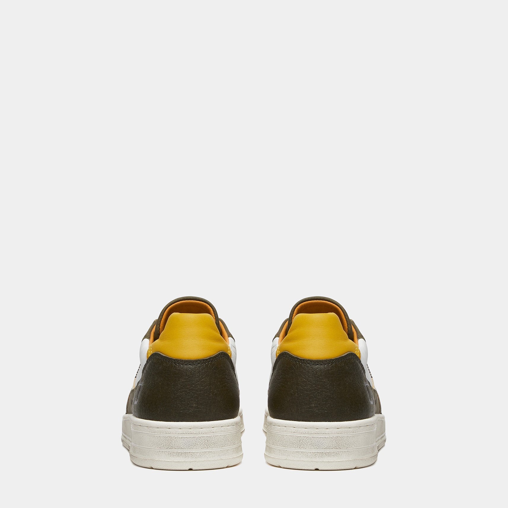 Sneakers bassa in pelle colore bianca, con inserti in nabuk e suede colore verde e talloncino arancio.