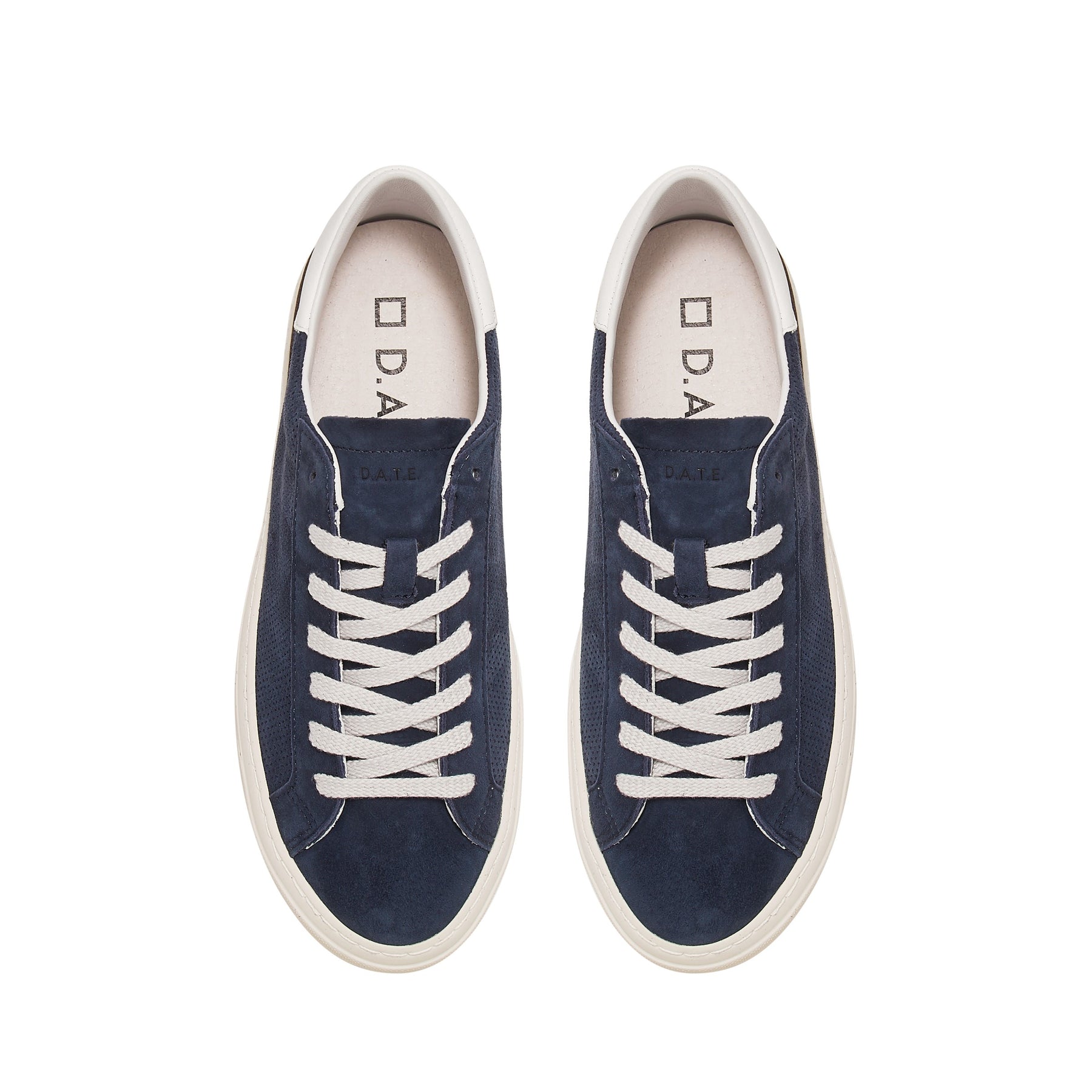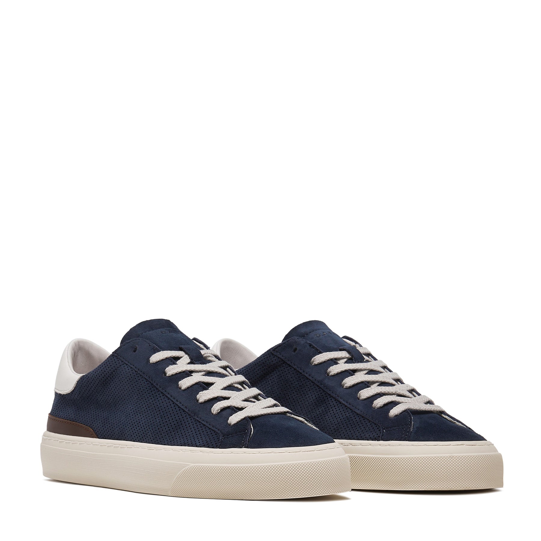 Sneakers in tessuto suede traforata blu con talloncino in contrasto bianco.