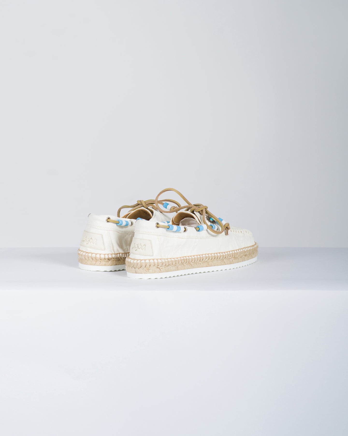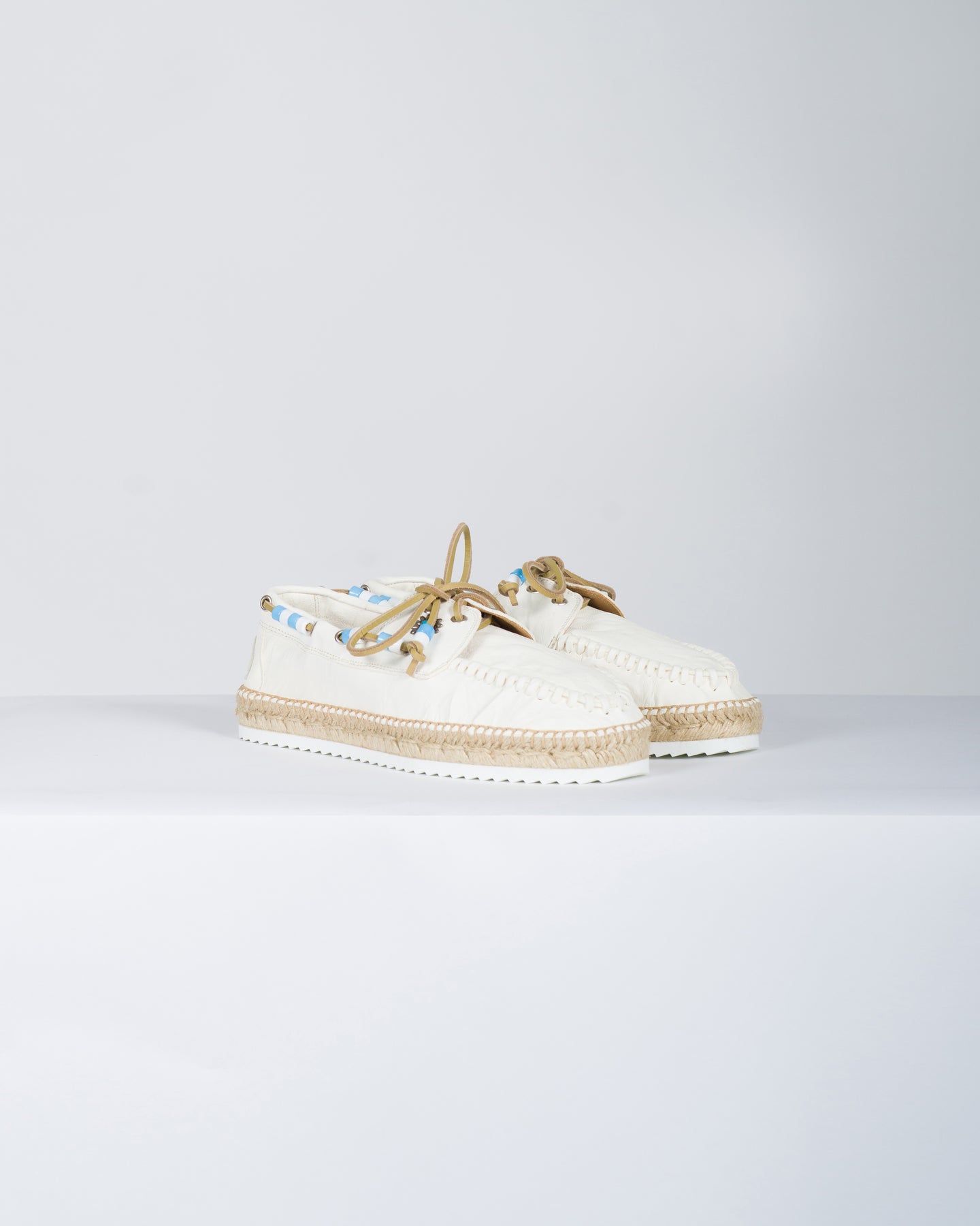 Topsiders in pelle lavata bianca, con lacci in pelle più perline, intersuola in corda con battistrada leggero micro bianco