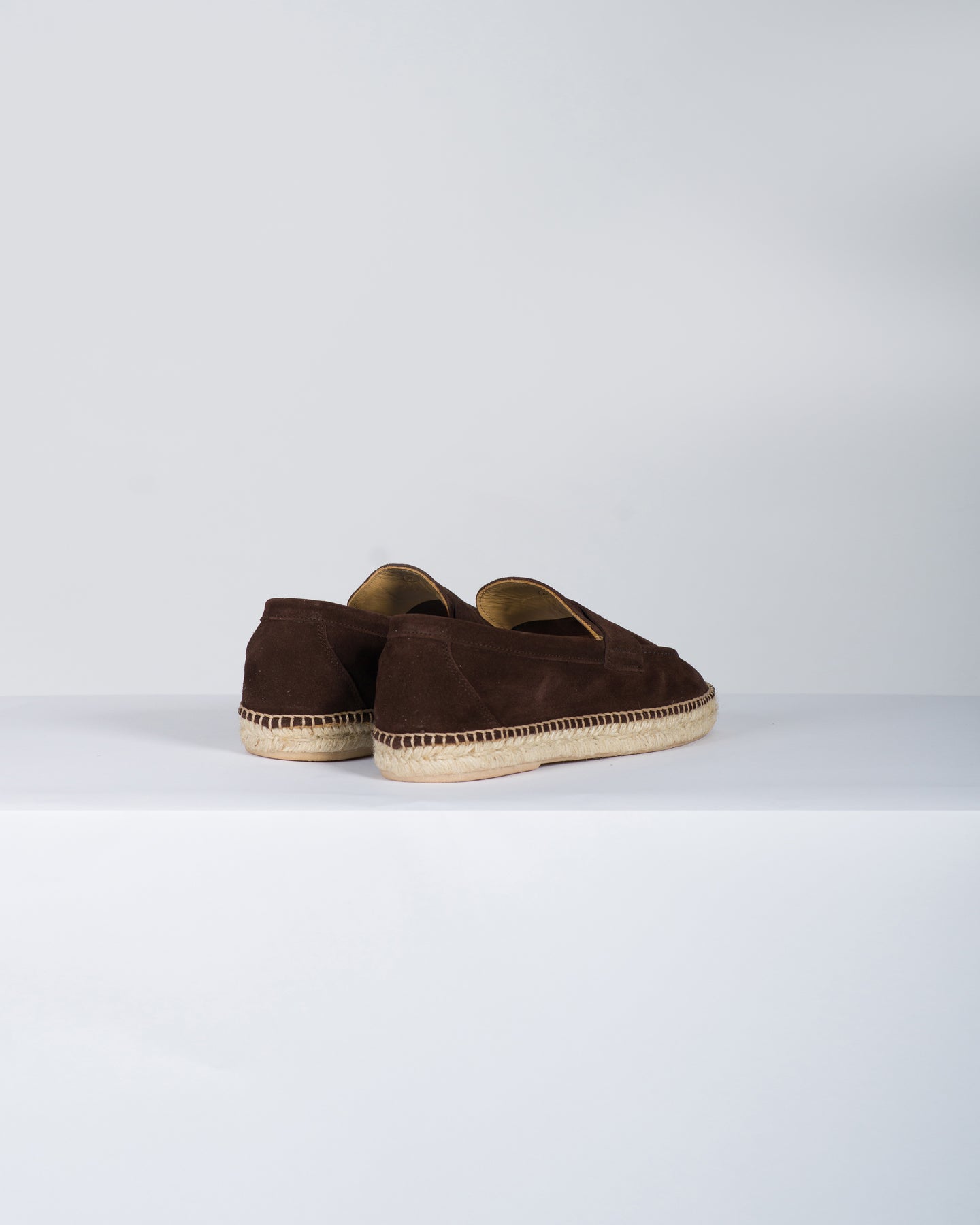 Mocassino in camoscio pietra con suola in corda naturale vulcanizzata.