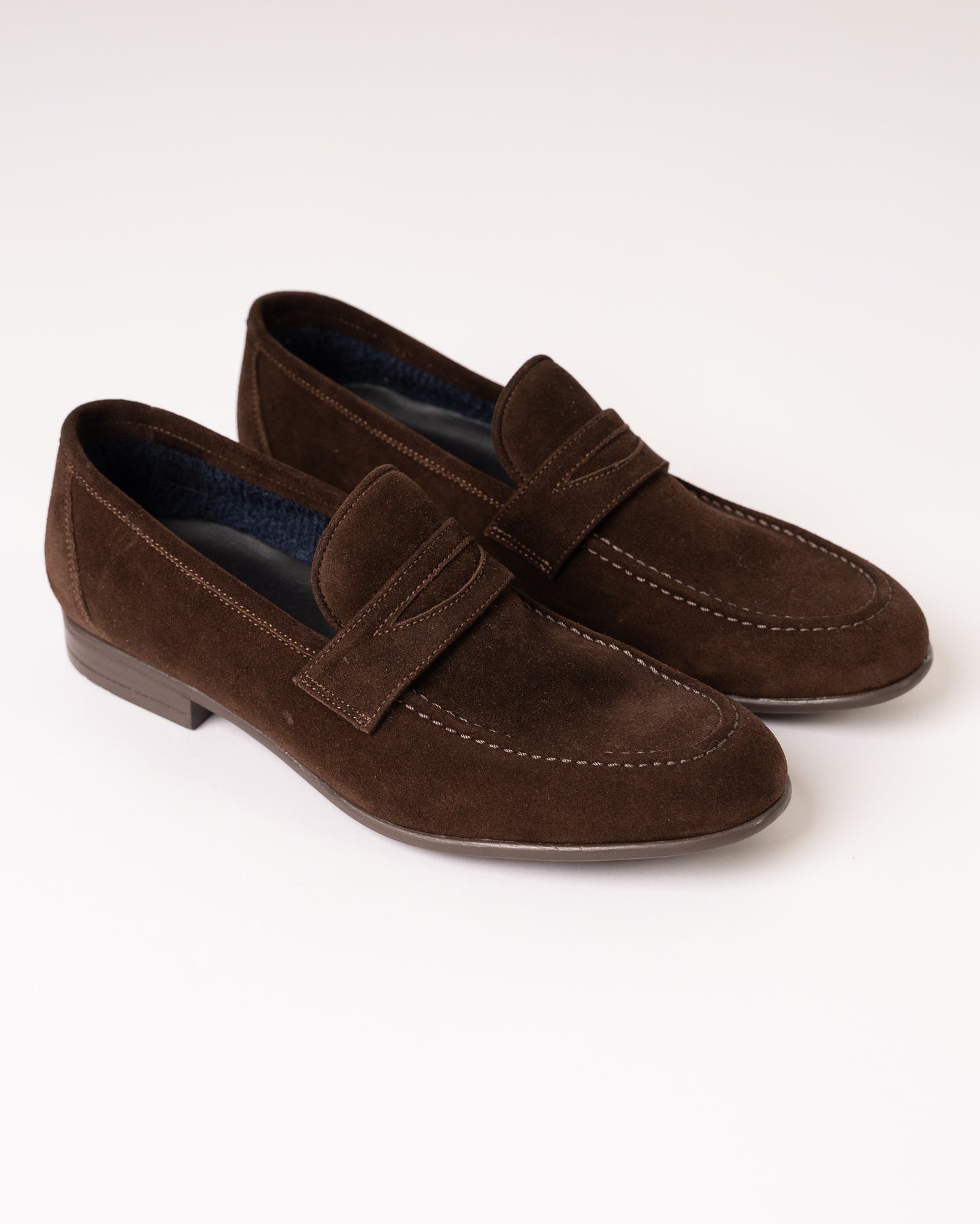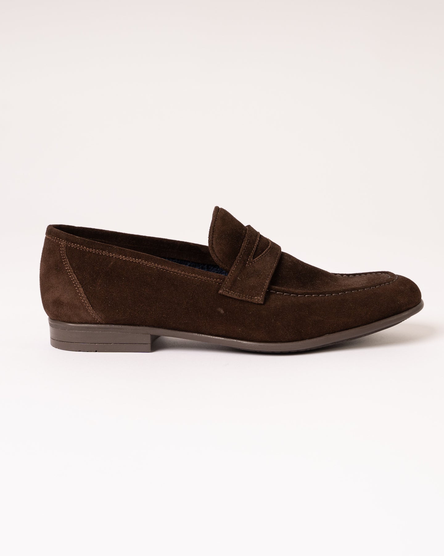Mocassini in camoscio colore testa di moro con fibbia e suola in gomma ultra light.