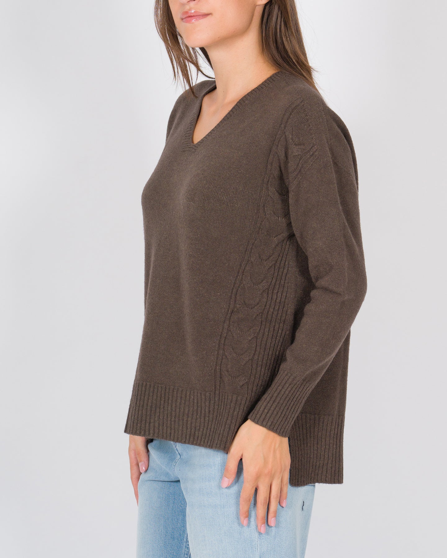 Un capo sofisticato che coniuga eleganza e comfort. Realizzata in tessuto di viscosa dalla mano morbida, questa maglia presenta volumi fluidi e uno scollo a V che valorizza la silhouette. I dettagli a treccia lungo i lati aggiungono un tocco artigianale e raffinato, mentre i polsini e il fondo a costine assicurano una vestibilità definita. Perfetta per look casual-chic o abbinata a capi tailoring.Dettagli:Tessuto: viscosa leggeraColore: cacaoScollo a VManiche lungheDettagli a treccia lungo i latiPolsini e fondo a costineVestibilità fluida con volumi morbidi