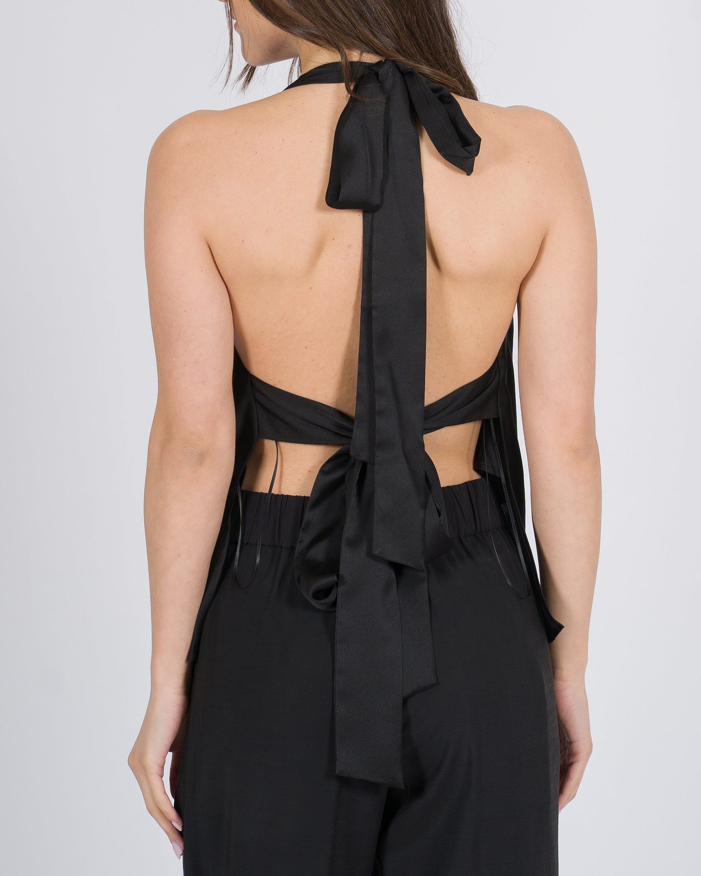 Luminoso e sofisticato, l'Halter top drappeggiato nero è il capo ideale per chi desidera un look elegante e di forte impatto. Il design halter valorizza spalle e décolleté, mentre il drappeggio fluido scolpisce la silhouette con naturale armonia. La finitura dorata cattura la luce, donando un'allure glamour e contemporanea.Perfetto per serate esclusive, eventi speciali e occasioni chic, si abbina con pantaloni sartoriali, gonne midi o completi coordinati per un outfit luxury impeccabile.