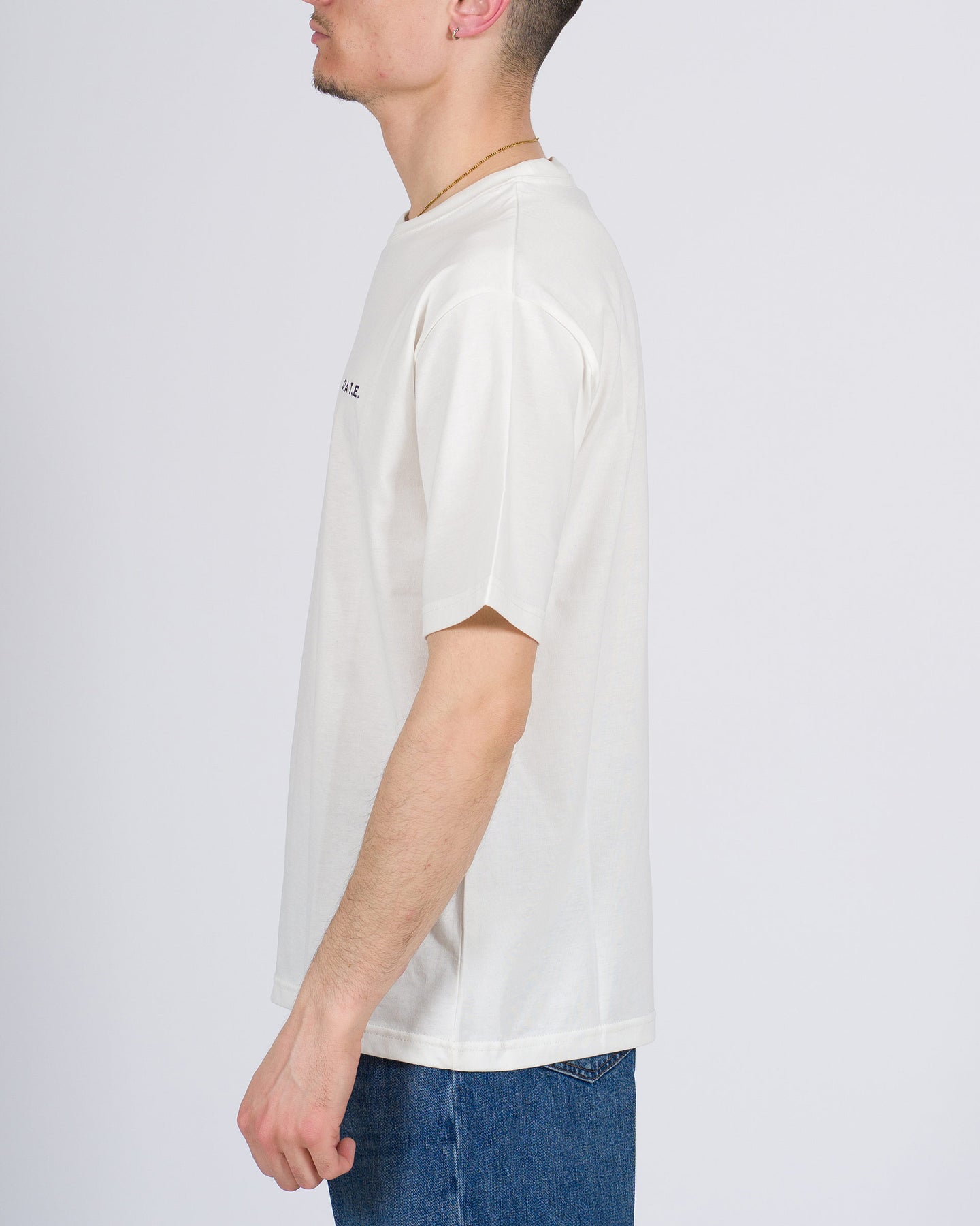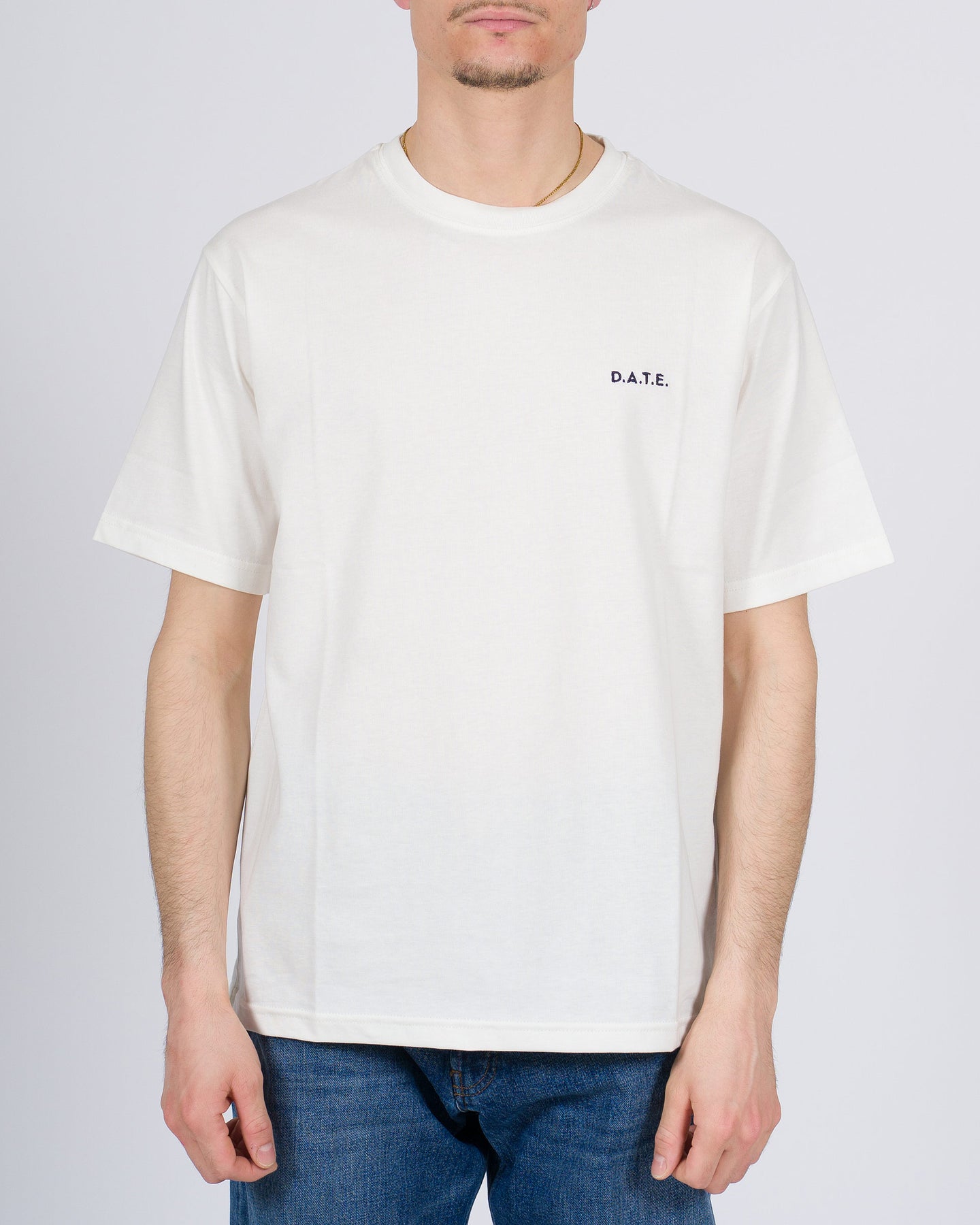 T-shirt modello Basic del brand Date in morbido tessuto cotone avorio, mezza manica, con piccolo loghetto sul petto per un dettaglio discreto e raffinato. Vestibilità comoda, perfetta da abbinare a jeans o pantaloni per outfit quotidiani dallo stile casual e contemporaneo.Ideale per chi cerca comfort, praticità e un design elegante in ogni occasione.