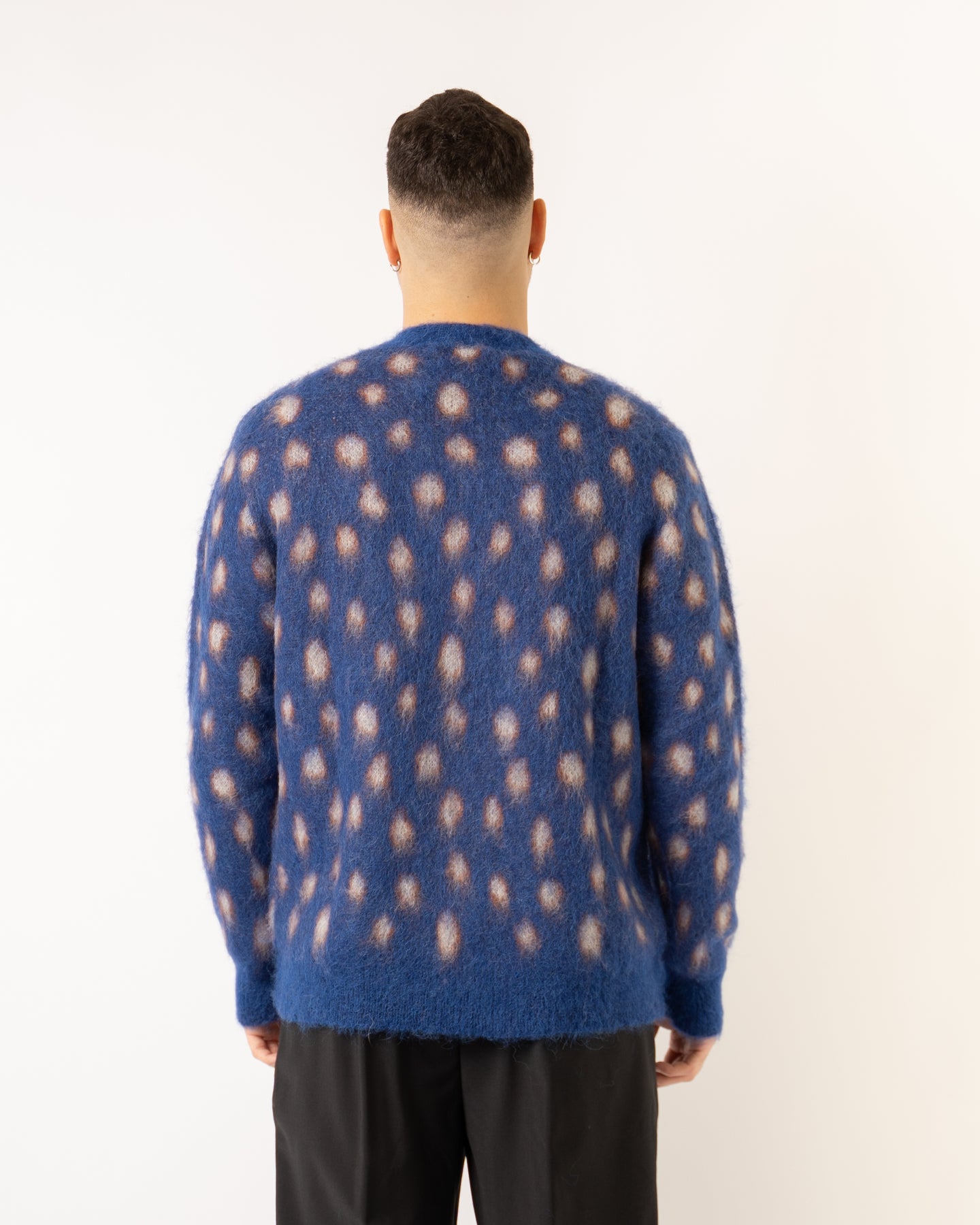 Cardigan in tessutro mohair bluette con fantasia bolle.