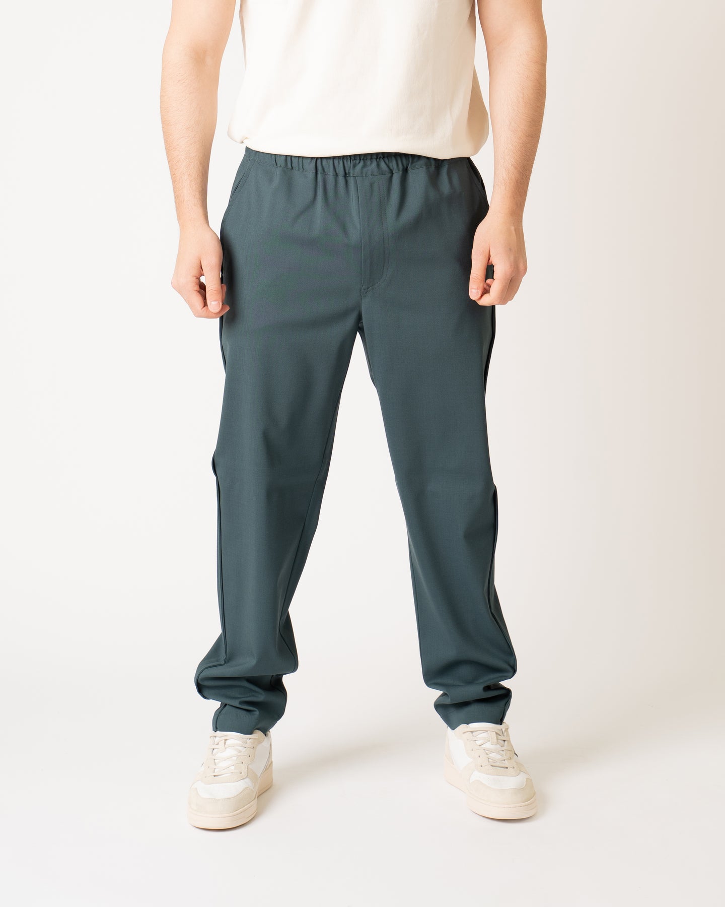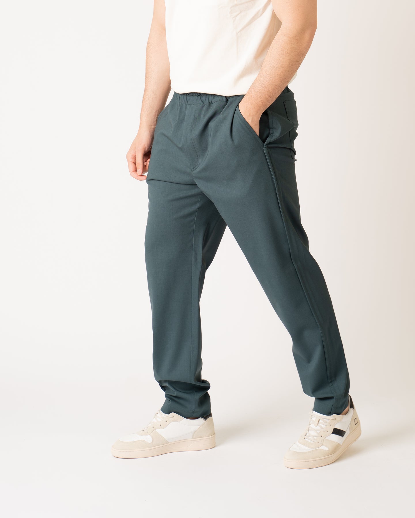 Trousers with elastic in cool teal color wool fabric.