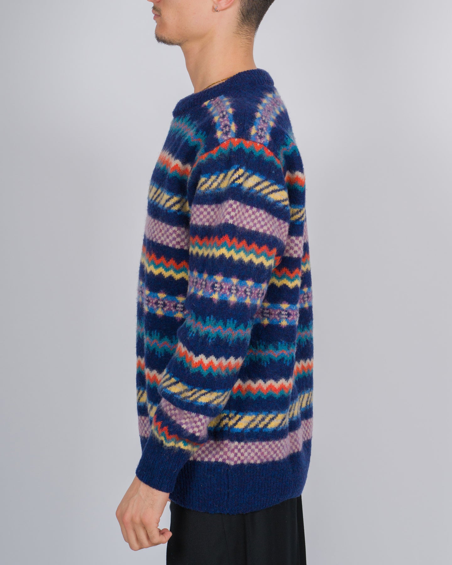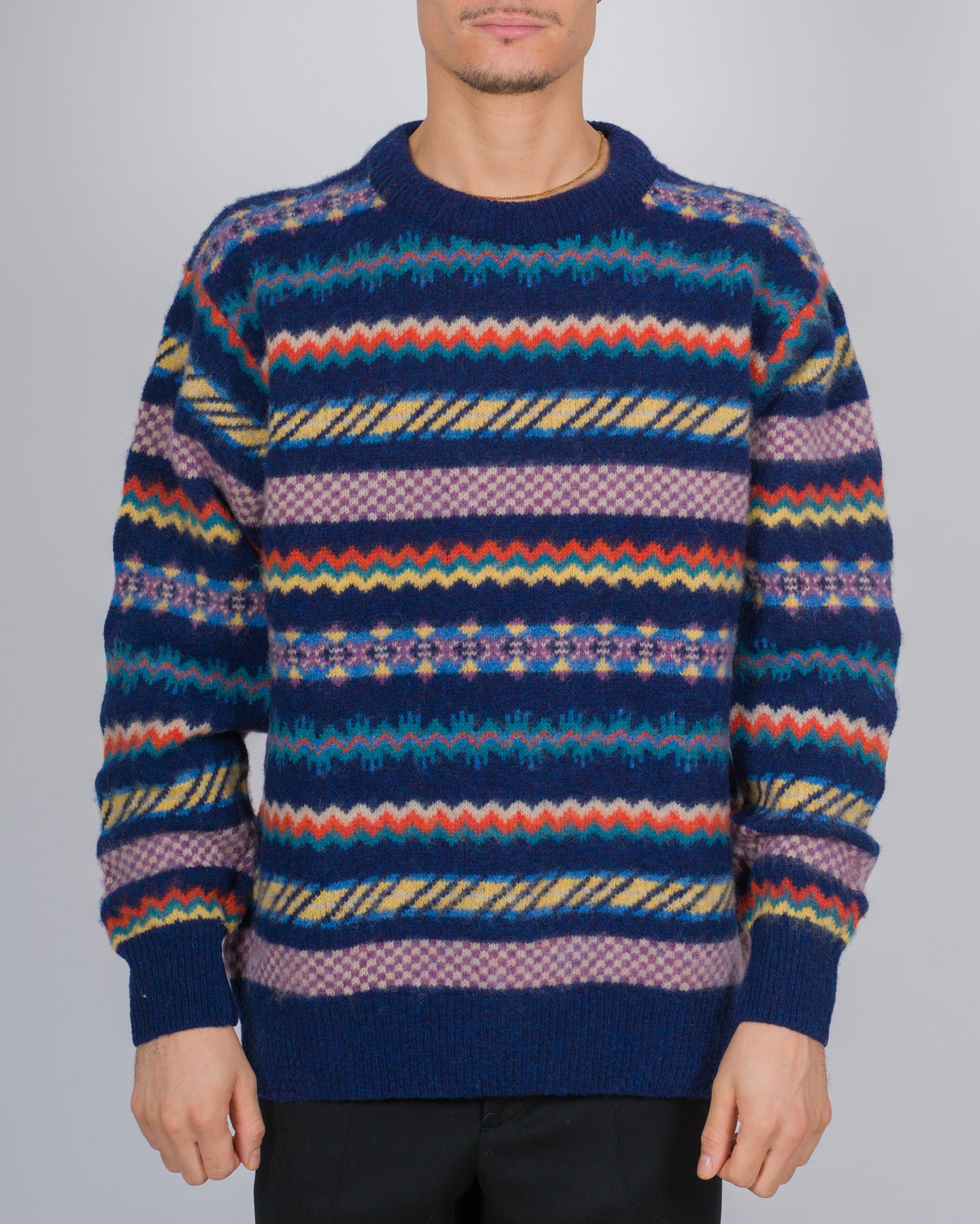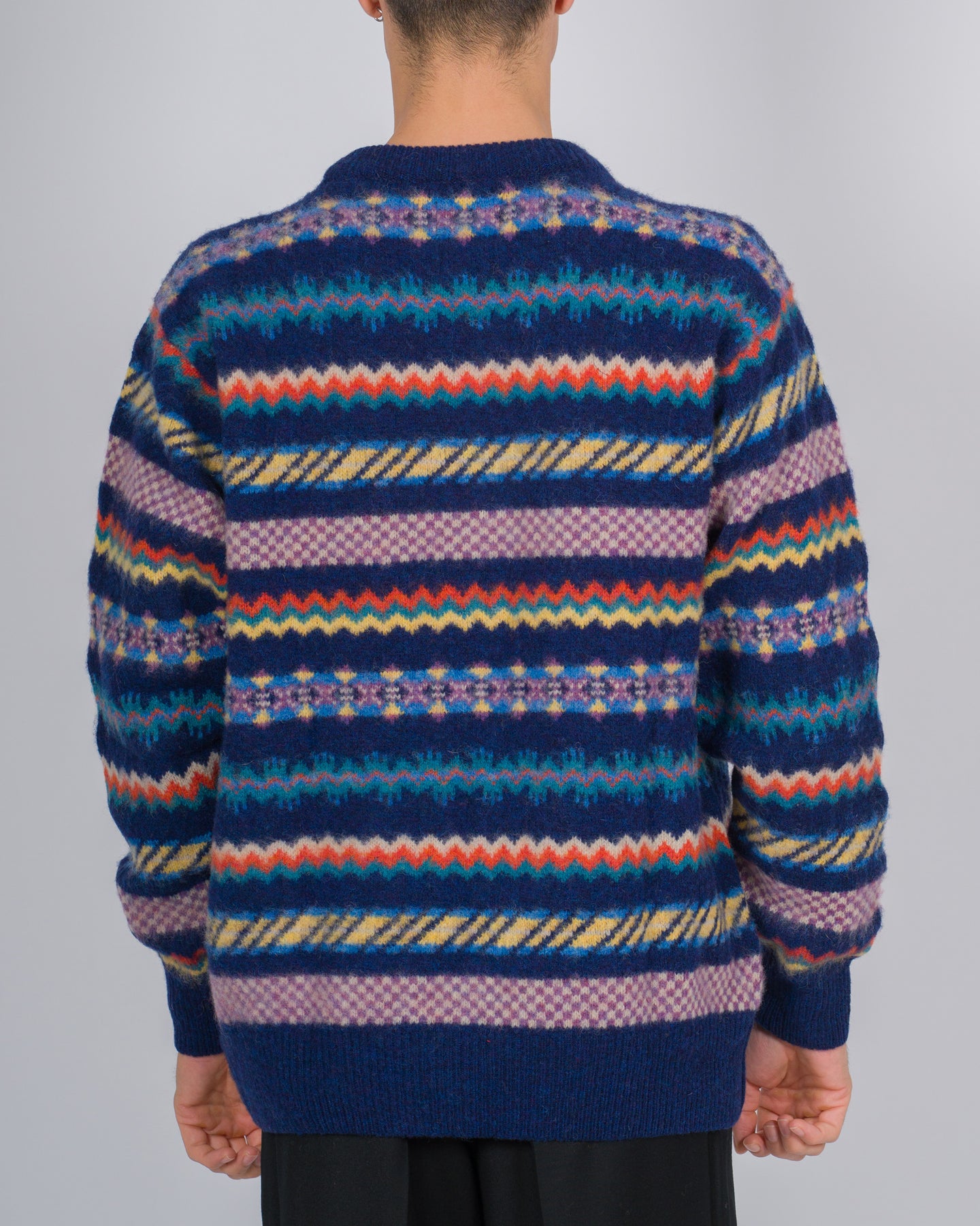 Un approccio artigianale e ironico al knitwear distingue le creazioni di HOWLIN'. Realizzato in Olanda con pura lana proveniente dalla Scozia, questo maglione girocollo unisce tradizione e spirito moderno.Il modello presenta una lavorazione morbida, maniche lunghe e un gioco di intarsi colorati che aggiunge personalità e carattere al design essenziale. Perfetto per chi cerca comfort, qualità e un tocco di originalità.