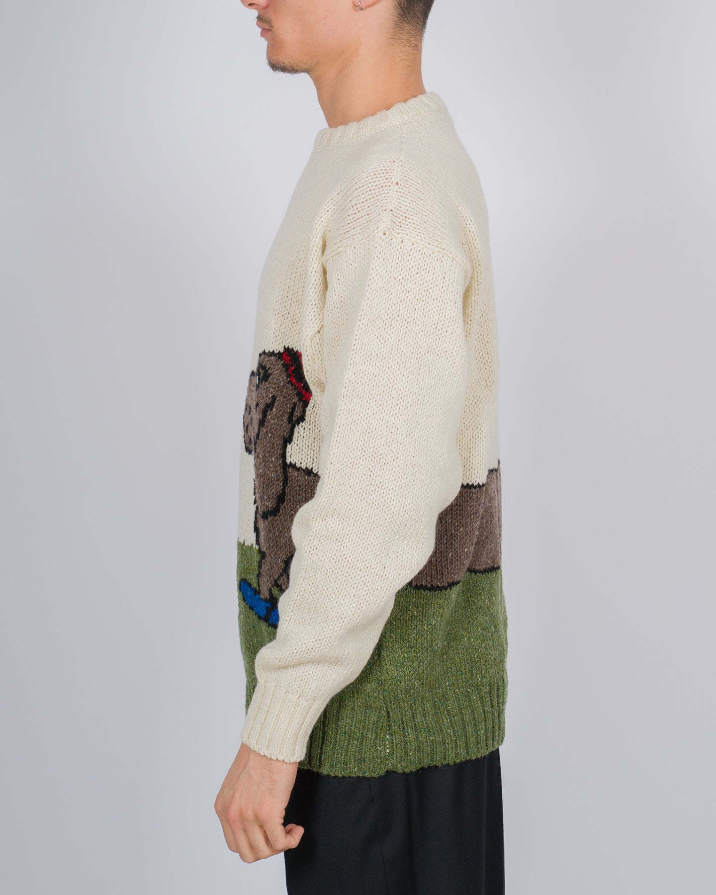 Un equilibrio tra ironia e artigianalità caratterizza questo maglione firmato HOWLIN'. Realizzato in Olanda con pura lana scozzese, presenta una lavorazione morbida e un fit regolare pensato per garantire comfort e calore.Il fondo panna esalta l'intarsio raffigurante un cane, dettaglio distintivo che aggiunge personalità al capo senza rinunciare alla raffinatezza. Perfetto per un look casual ma curato.