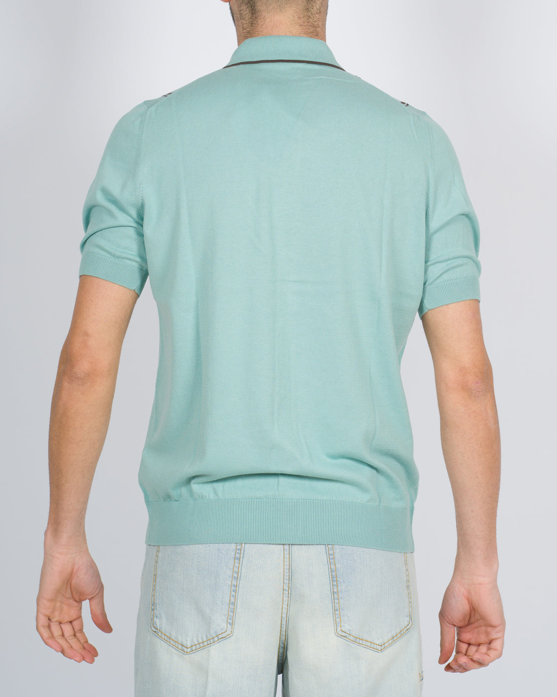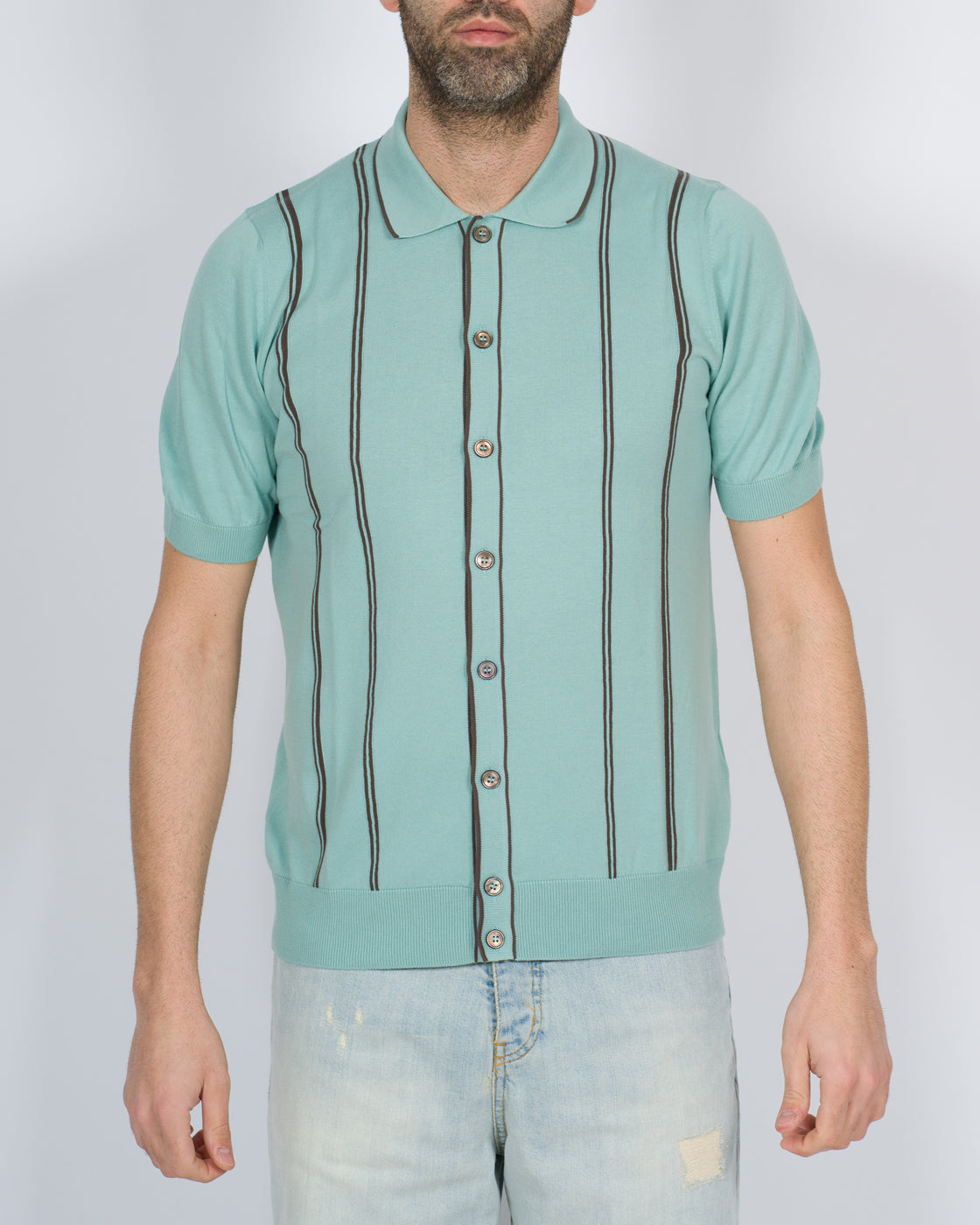 Polo mezza manica con chiusura bottoni con riga in contrasto marrone.Il modello è alto 1,90 e indossa la taglia 52.