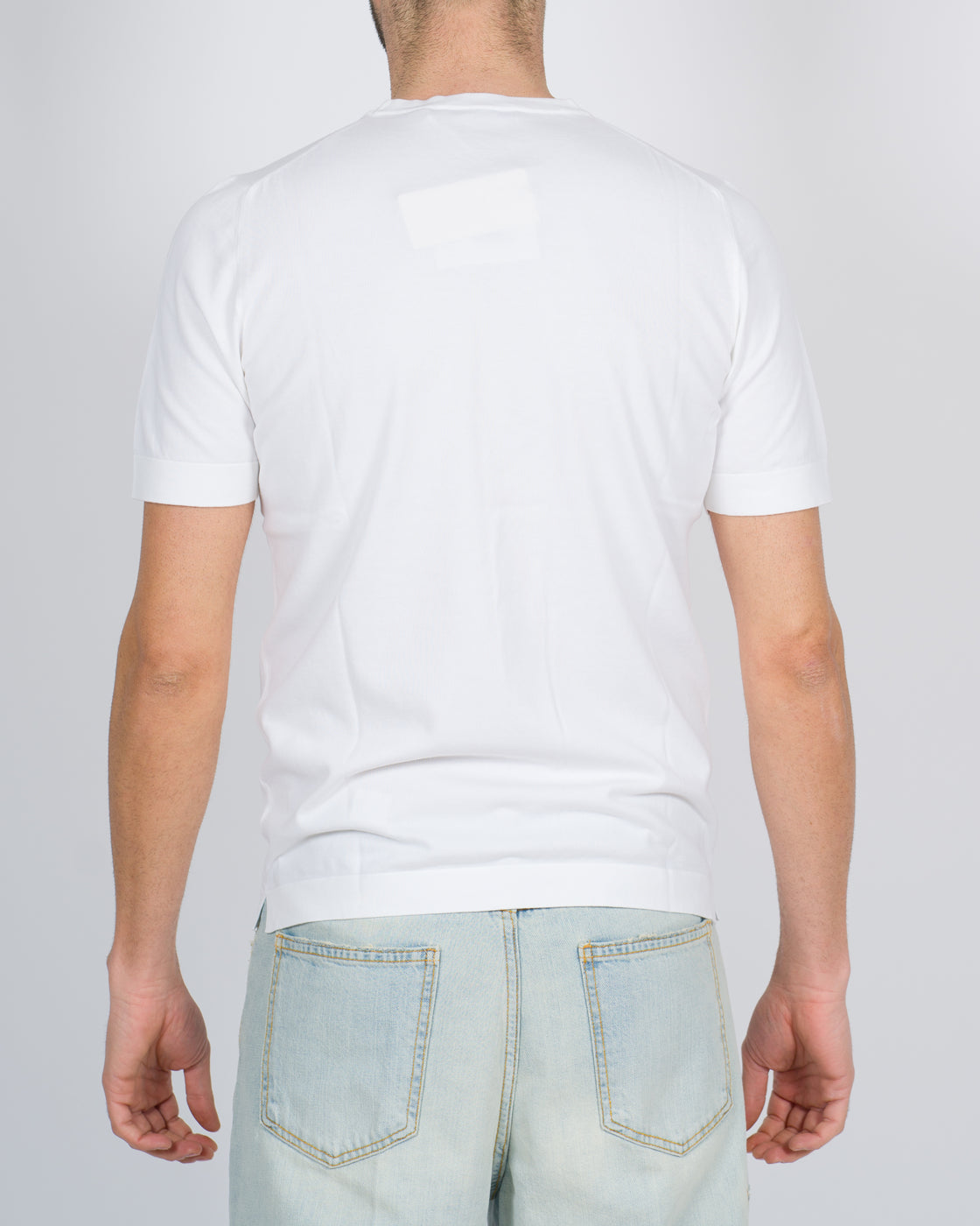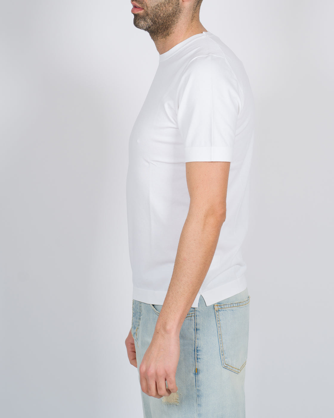 Girocollo mezza manica tinta unita in tessuto filo di cotone.Il modello è alto 1,90 e indossa la taglia 52.