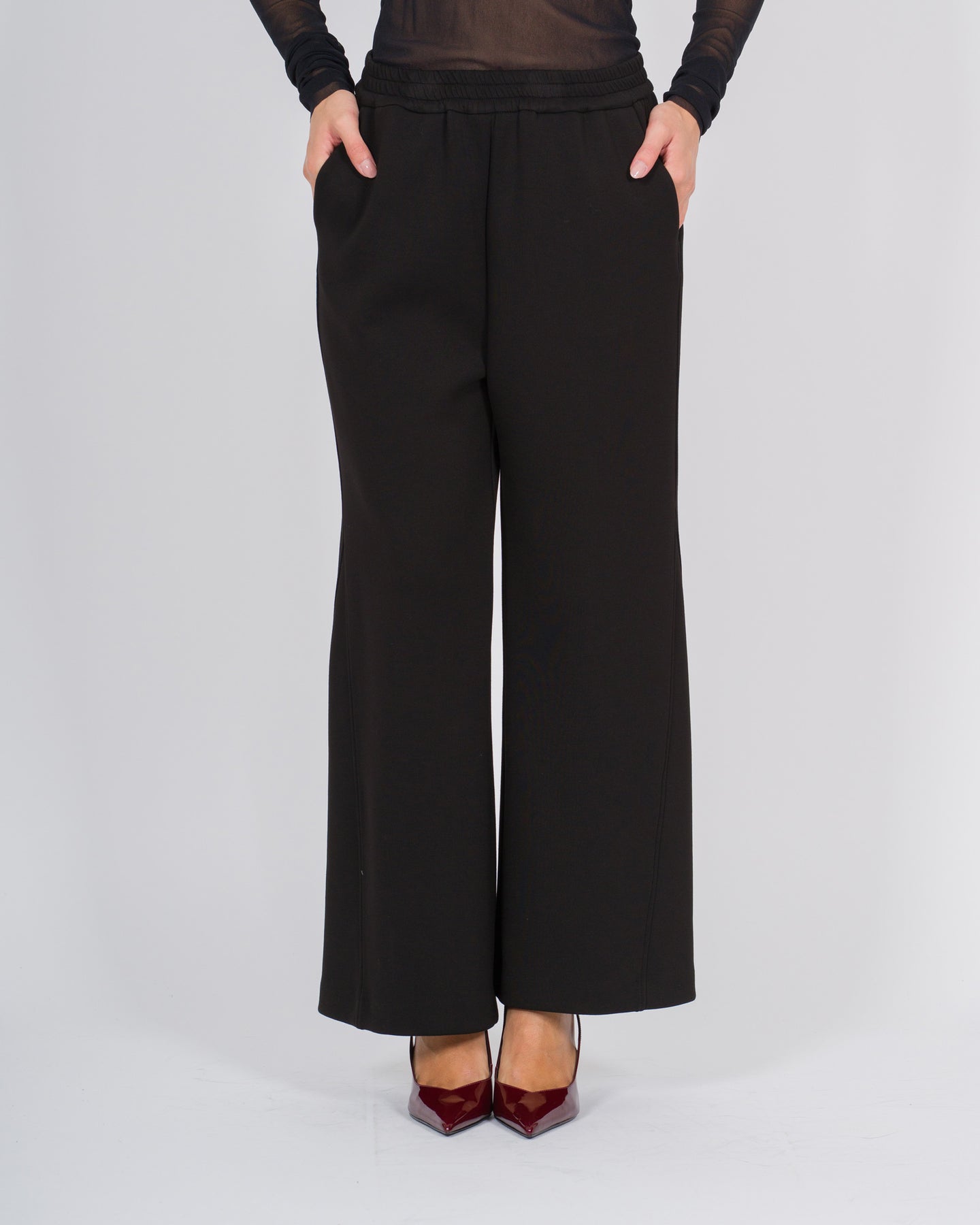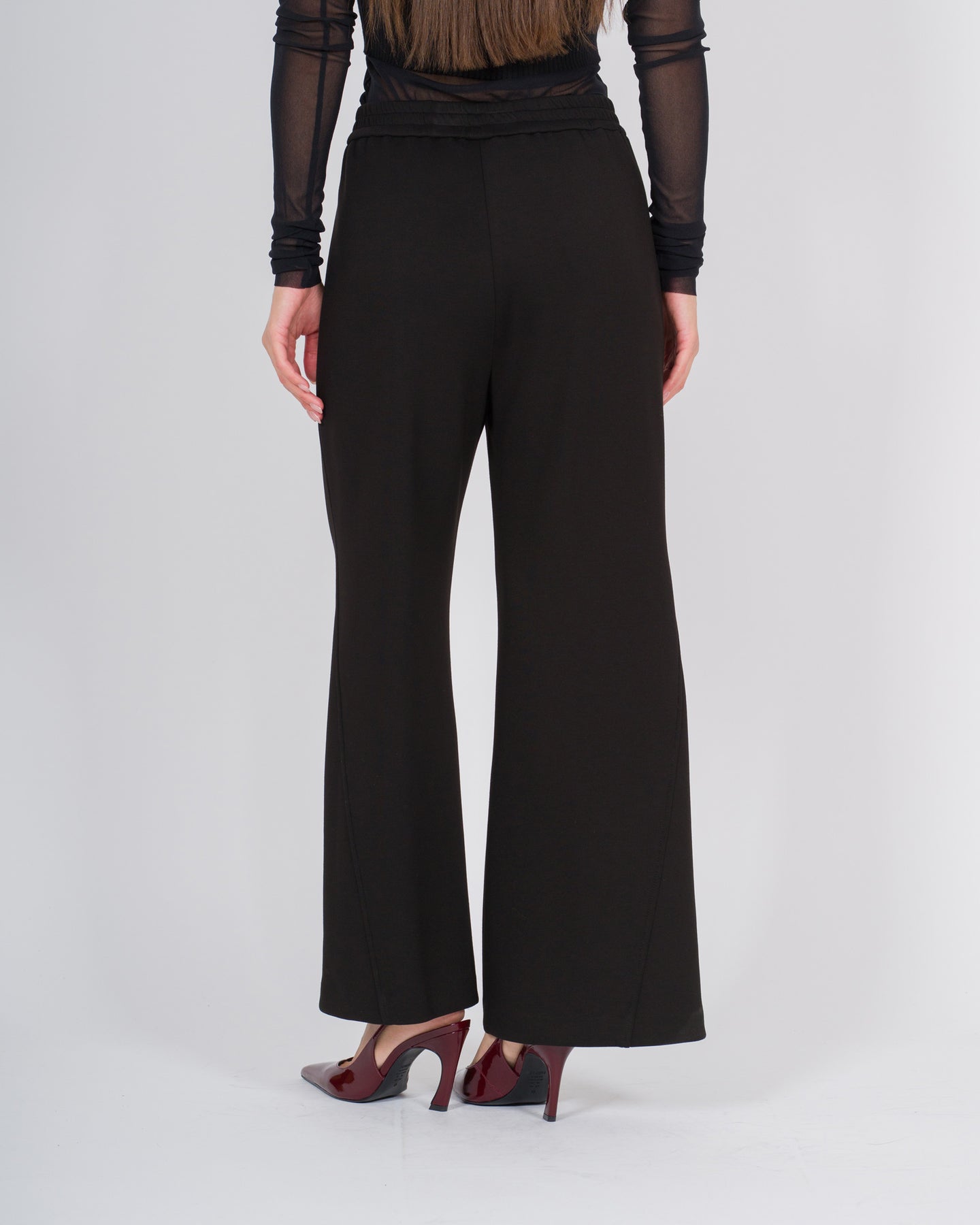 Questi pantaloni a vita alta in jersey neri firmati Meimej uniscono eleganza contemporanea e comfort senza compromessi. Il bustino elastico in vita assicura una vestibilità perfetta, modellando delicatamente il ventre e valorizzando la silhouette con naturalezza.Il tessuto morbido e leggermente strutturato dona fluidità e scivolosità al capo, rendendolo versatile per look casual raffinati o abbinamenti più sartoriali. Ideali da indossare con bluse leggere, maglioni aderenti o blazer, diventano un capo essenziale nel guardaroba contemporaneo.