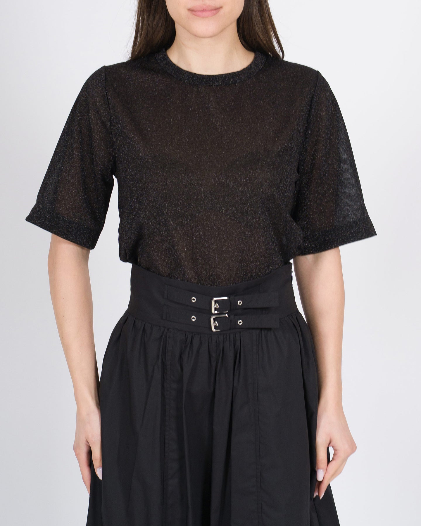 Eleganza luminosa, vestibilità morbida, stile contemporaneo.La t-shirt MEIMEJ in lurex nero avvolge la silhouette con comfort, combinando linee essenziali a un dettaglio scintillante per un look minimal e sofisticato.Un capo versatile, perfetto da abbinare a pantaloni larghi, gonne o bermuda per outfit eleganti e ricercati.