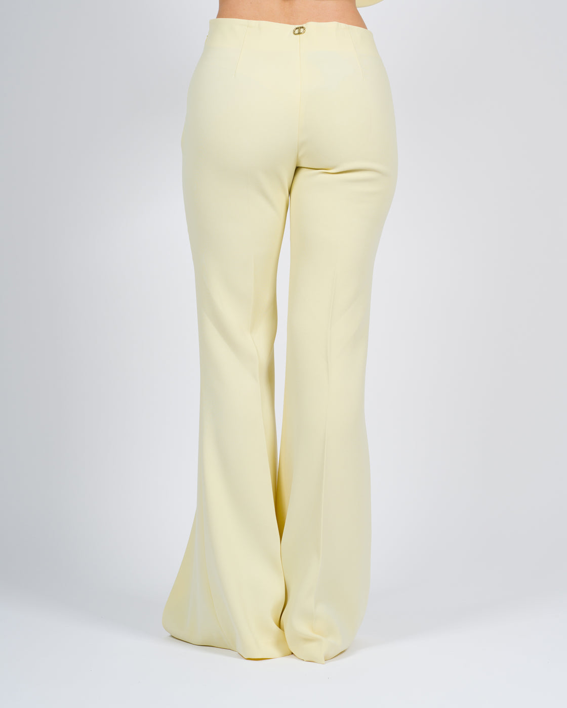 Pantaloni made in Italy in crêpe fluido stretch con zip invisibile al fianco, piega stirata, placchetta logo Oval T sul retro, linea flare.