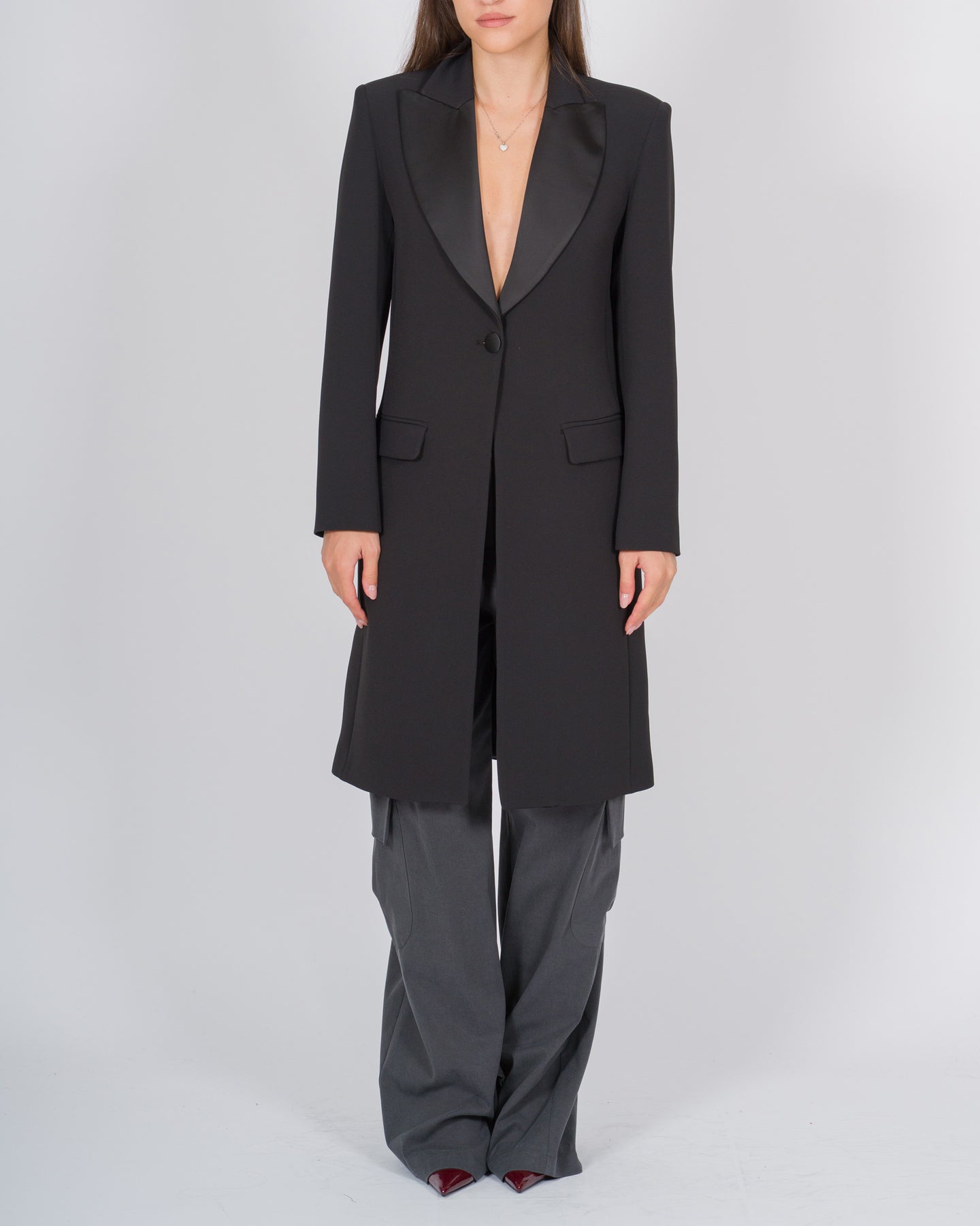 Cappotto lungo donna nero con petto a lancia in raso, linea elegante e sofisticata. Un capospalla raffinato ideale per look formali e serali.