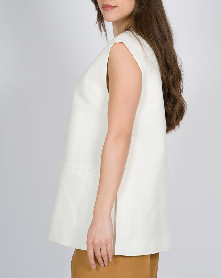 Gillet giro manica in tessuto lino aperto senza bottoni.