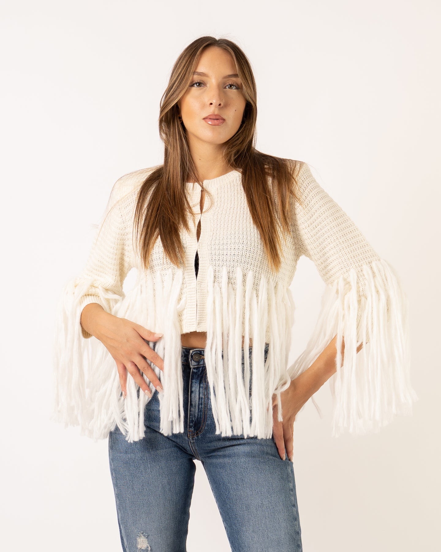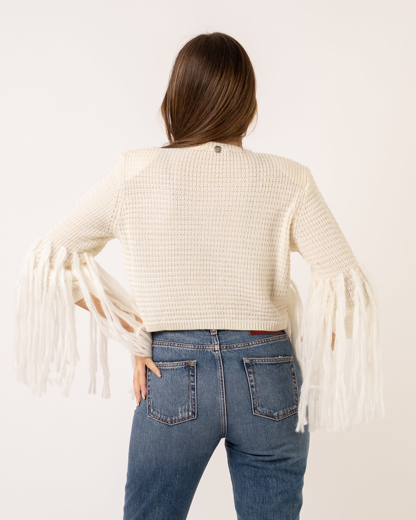 Giacca in maglia con frange in lana e fili lurex sulle lunghezze.