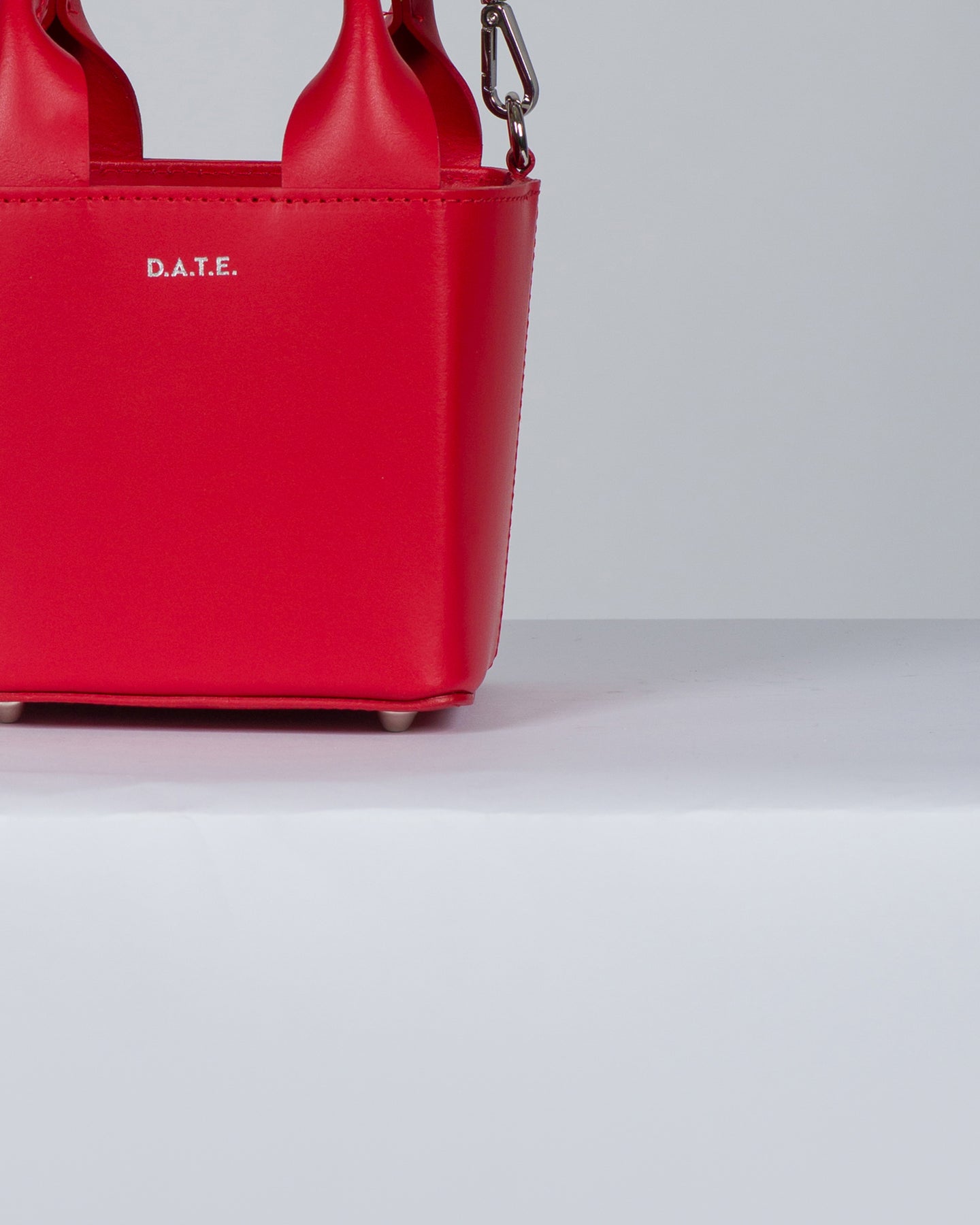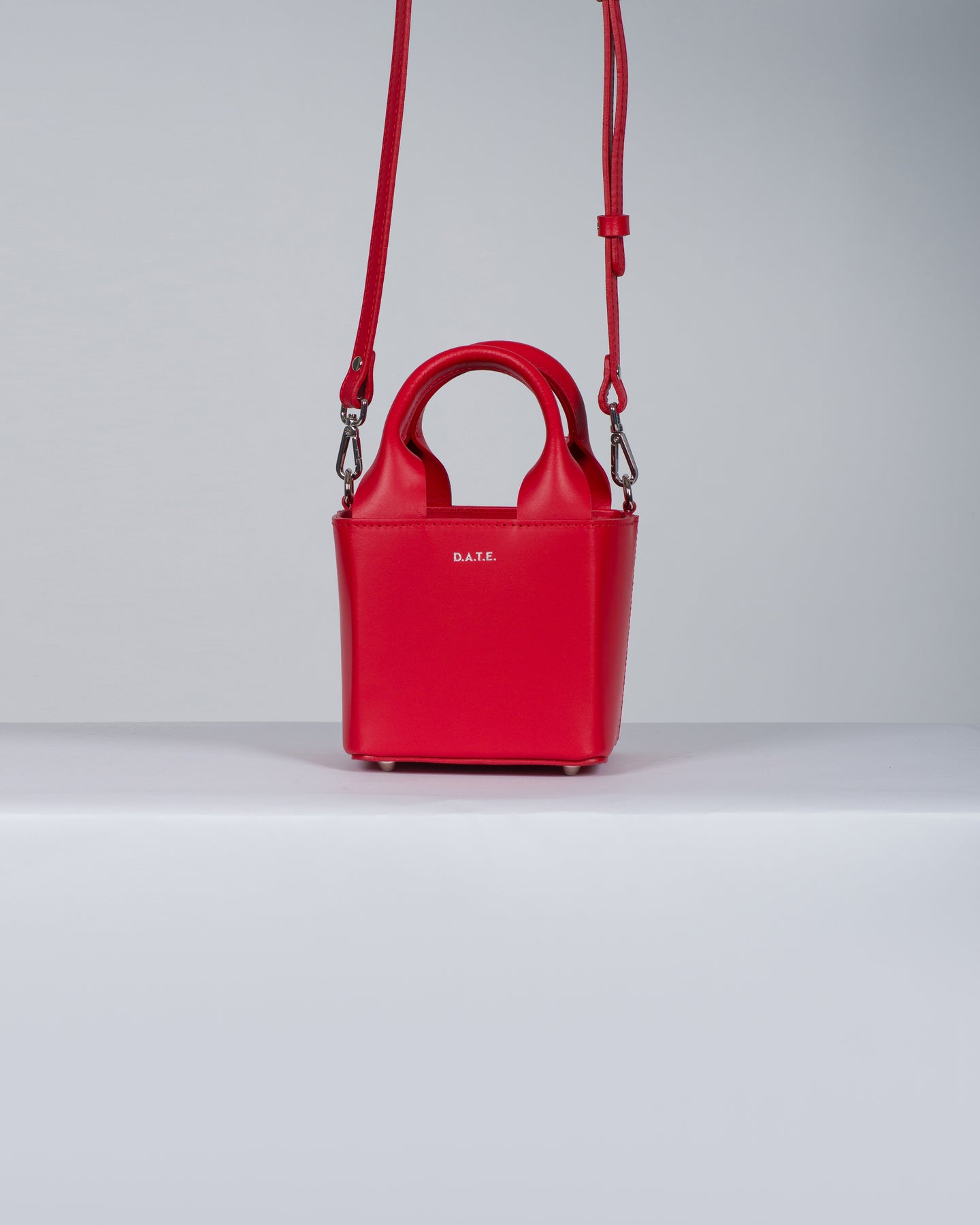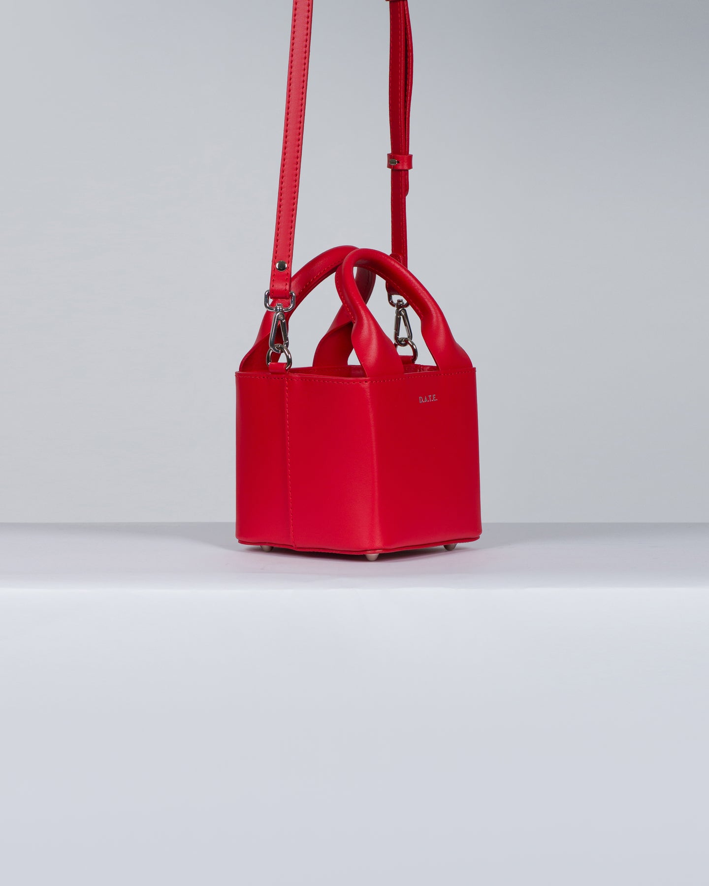 Borsa a mano di manifattura italiana realizzata in morbida pelle liscia di colore rosso.-Tinta unita con impunture in tono.-Due manici superiori semirigidi.-Logo D.A.T.E. stampato in colore argento sul fronte.-Fodera interna in nylon con coulisse di chiusura.-Piedini in metallo color argento sul fondo per evitare l'usura.-Tracolla regolabile e removibile tramite moschettoni applicati di lato in metallo colore argento.-Tasca piatta all'interno.-Misure: 15x15x15 cm