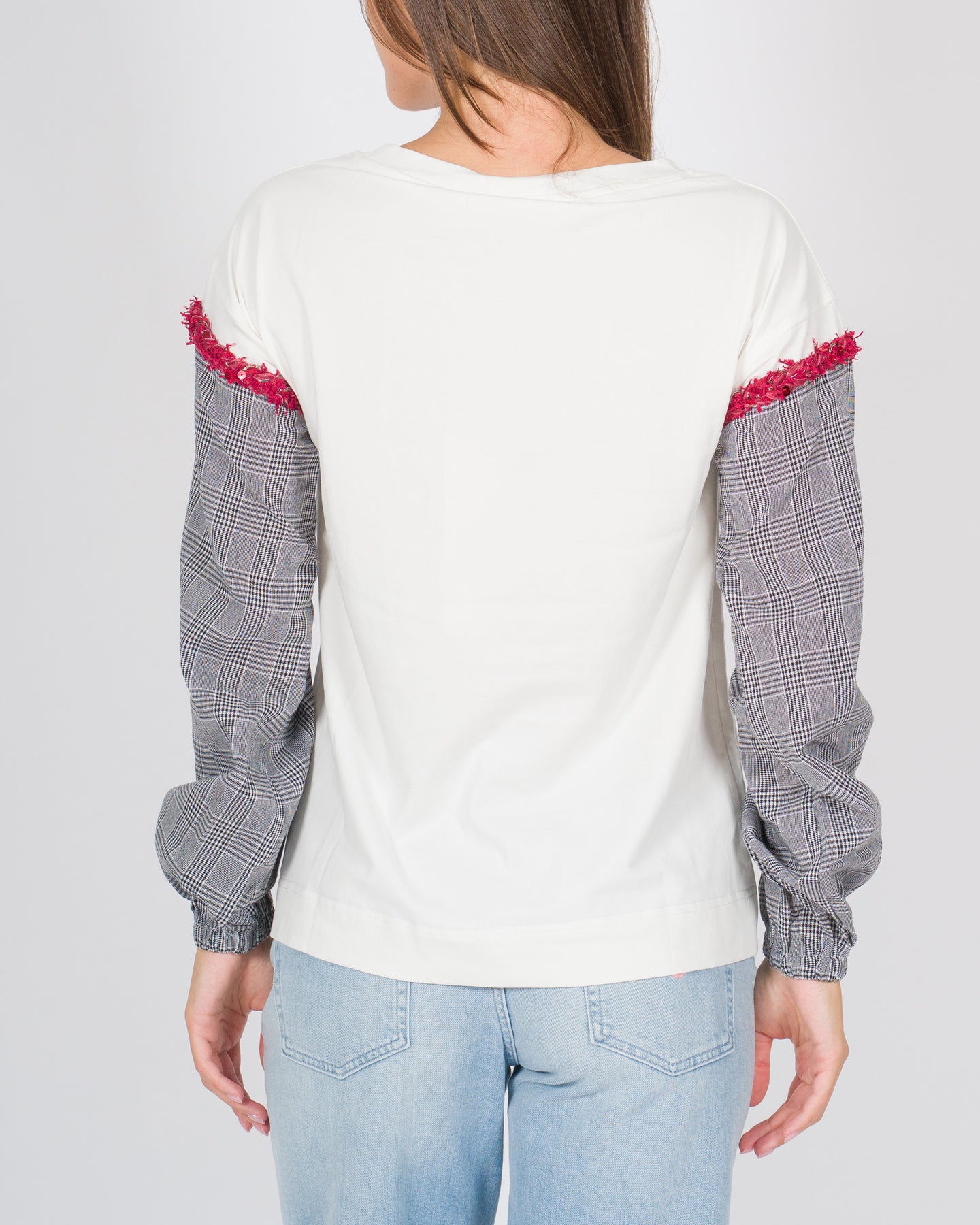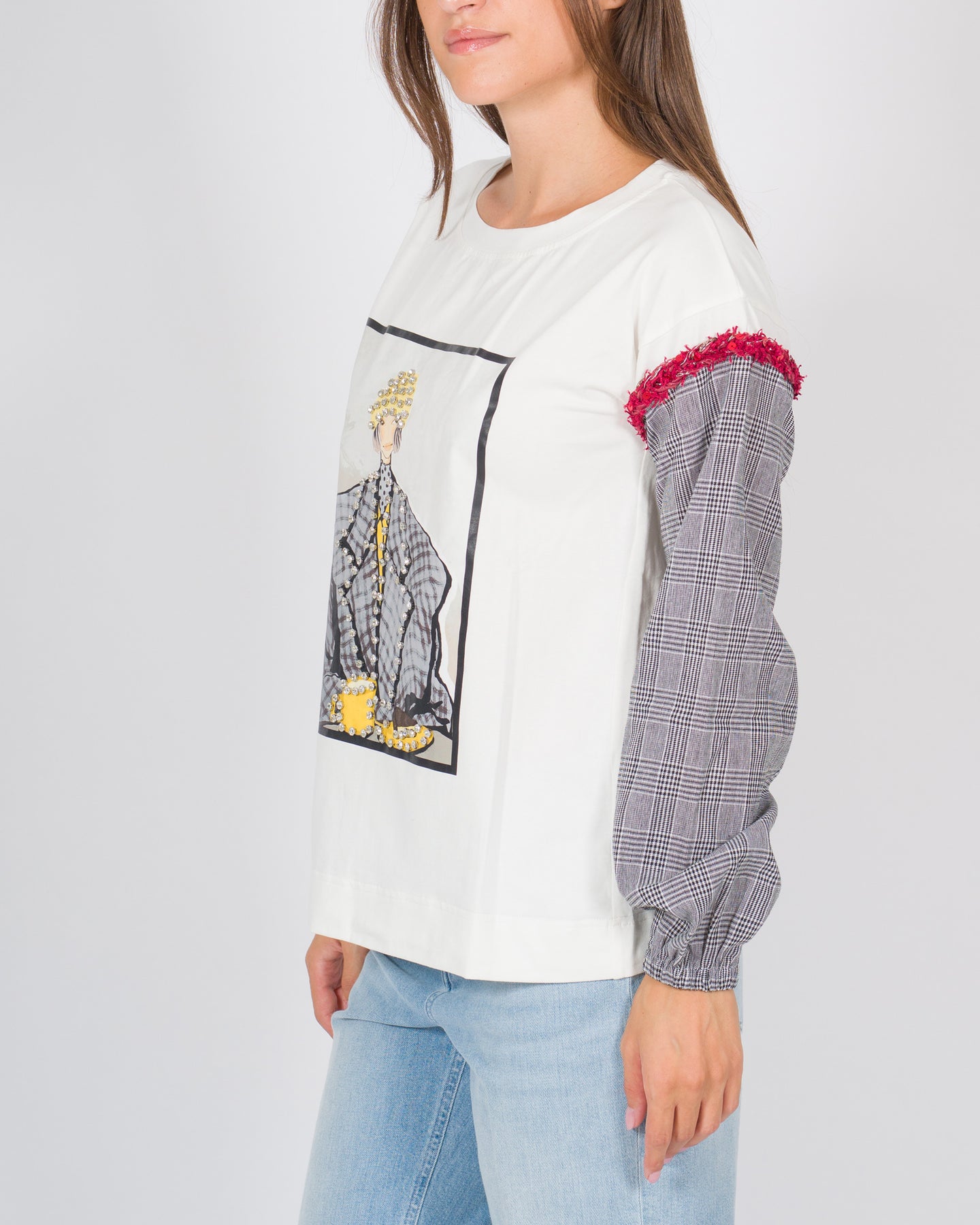 Una rilettura contemporanea della classica T-shirt a maniche lunghe. Il modello combina il comfort del cotone per la parte principale con una manica in tessuto di lana a quadretti, creando un interessante gioco di contrasti. La stampa centrale è arricchita da ricami rossi che aggiungono un tocco artigianale e distintivo. Un capo originale e versatile, perfetto per dare personalità a un look casual.Dettagli:Tessuto principale: cotoneManica in lana a quadrettiColore base: biancoStampa centrale con dettagli ricamati in rossoGirocolloStruttura ibrida: mezza manica in cotone + manica lunga in lanaVestibilità regolare