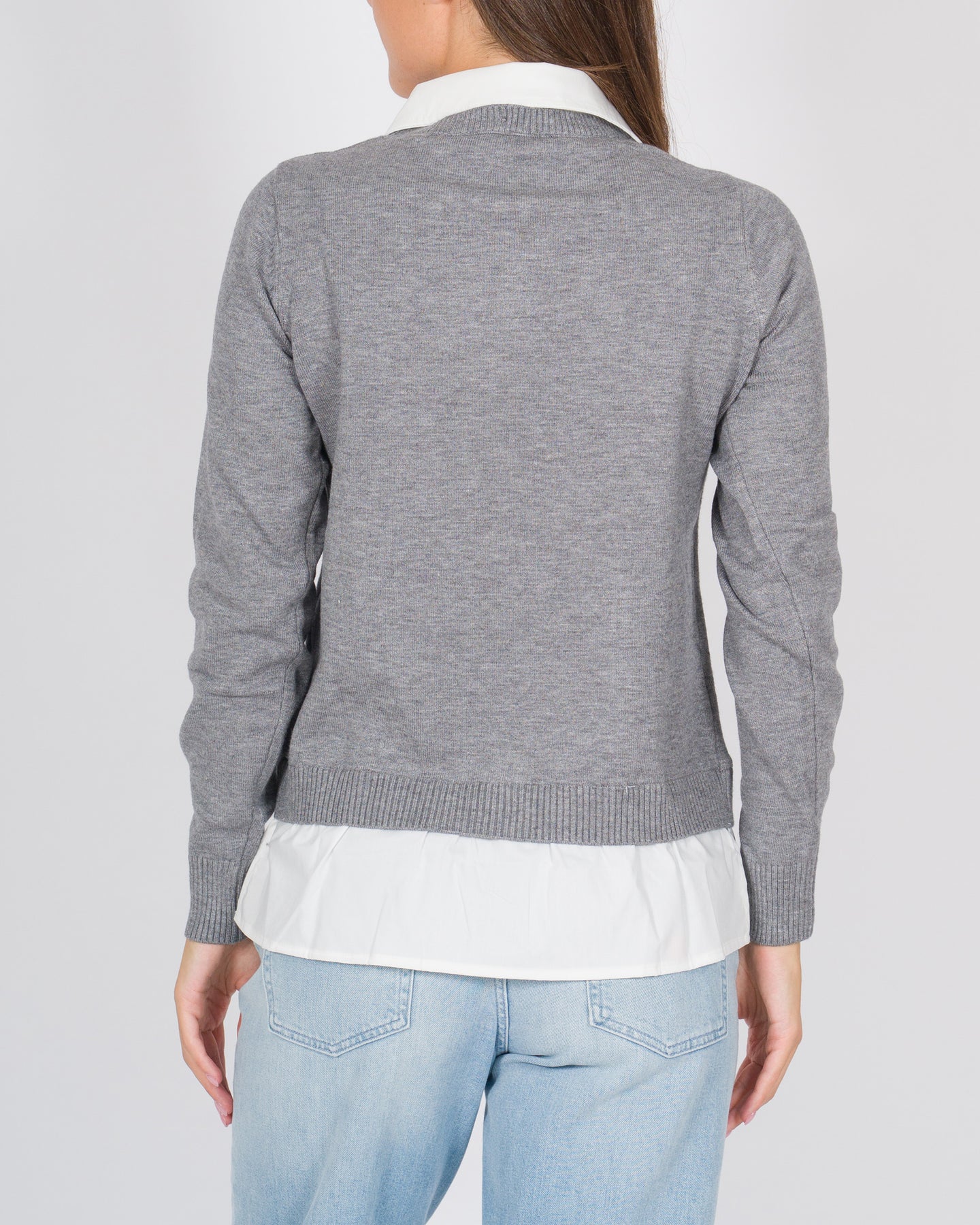 Questa maglia in lana con maniche lunghe unisce dettagli sartoriali e comfort quotidiano. Il design è arricchito da finte tasche ricamate, che donano un tocco di raffinatezza, e da una camicia applicata sul collo e sul fondo, creando un sofisticato effetto layering senza rinunciare alla praticità. La vestibilità aggiornata rende il capo versatile e perfetto per completare look casual chic o per aggiungere un dettaglio elegante ad outfit più formali.