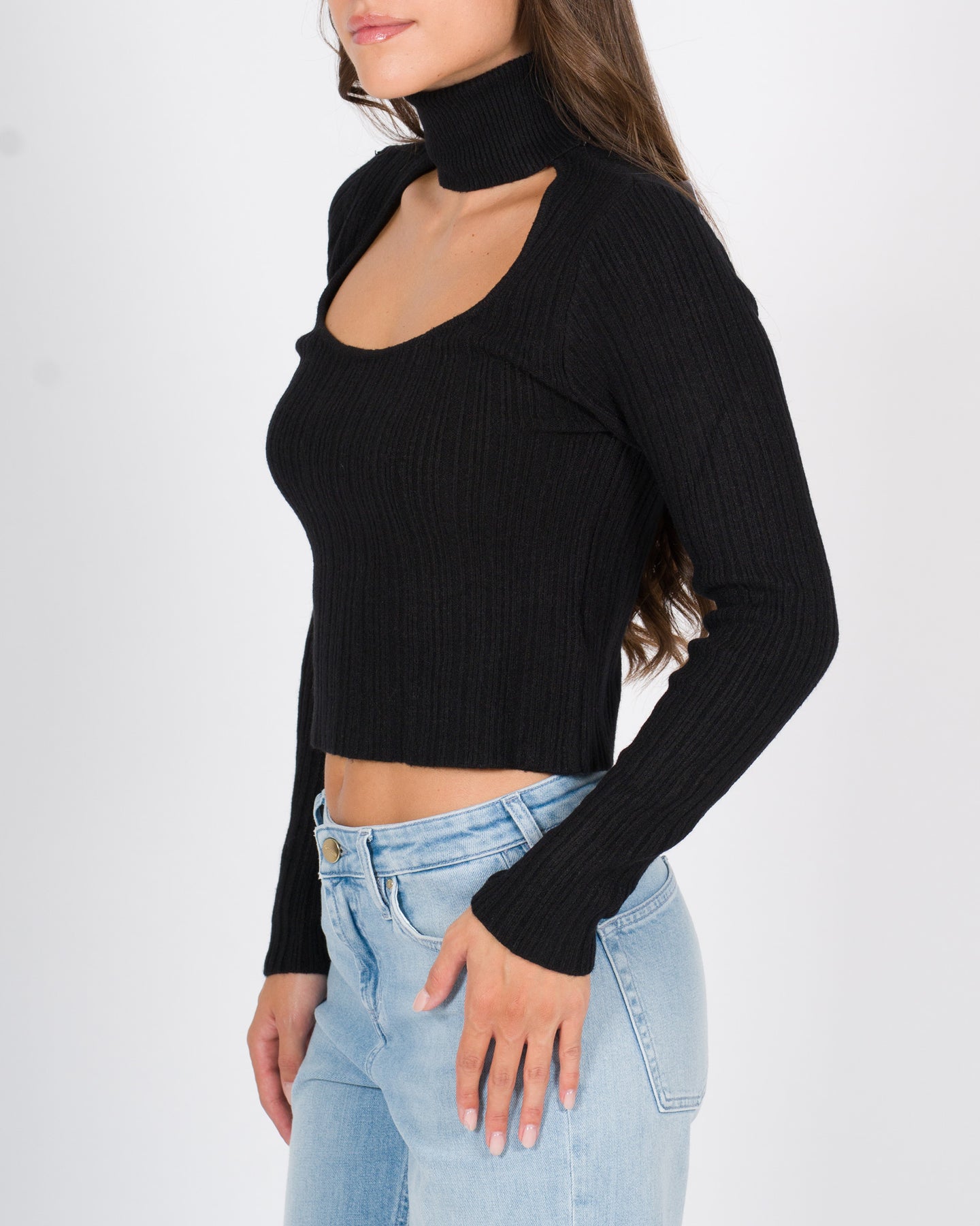 Maglia a manica lunga dal taglio moderno e femminile, realizzata in morbido tessuto di viscosa con raffinata lavorazione a costine che esalta le linee del corpo. Il design presenta un lupetto minimal sul retro e una scollatura profonda sul davanti, creando un interessante gioco di contrasti tra copertura e sensualità. La vestibilità cropped aggiunge un tocco audace e contemporaneo, perfetto da abbinare a capi a vita alta per un look deciso ma elegante.Dettagli tecnici:Scollatura profondaTessuto: viscosaVestibilità: croppedColore: neroLa modella indossa la taglia S/M ed è alta 1.70.