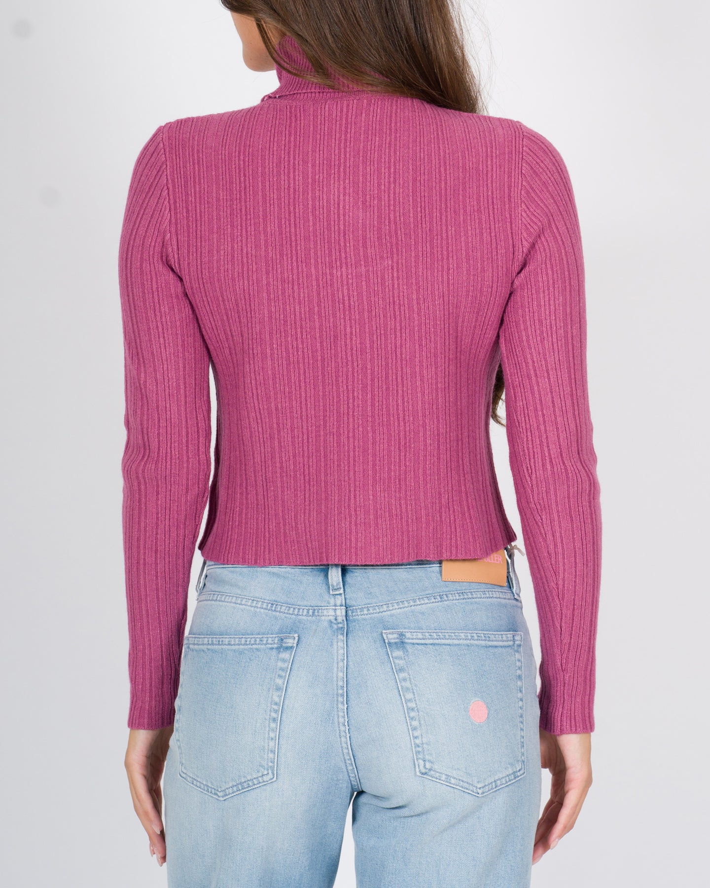 Maglia a manica lunga dal taglio moderno e femminile, realizzata in morbido tessuto di viscosa con raffinata lavorazione a costine che esalta le linee del corpo. Il design presenta un lupetto minimal sul retro e una scollatura profonda sul davanti, creando un interessante gioco di contrasti tra copertura e sensualità. La vestibilità cropped aggiunge un tocco audace e contemporaneo, perfetto da abbinare a capi a vita alta per un look deciso ma elegante.Dettagli tecnici:Scollatura profondaTessuto: viscosaVestibilità: croppedColore: rosaLa modella indossa la taglia S/M ed è alta 1.70.