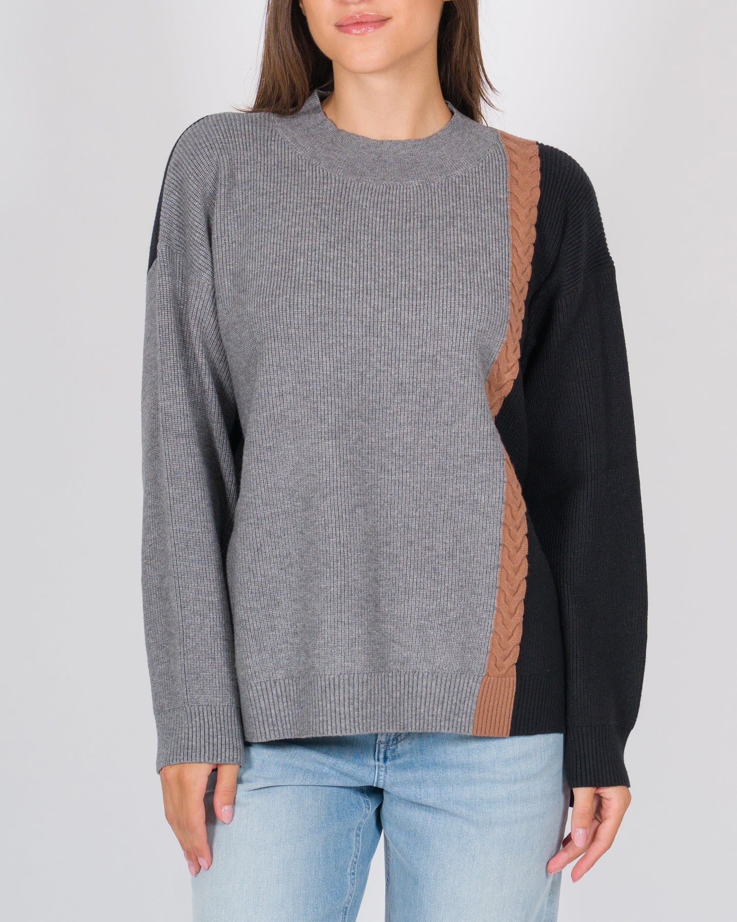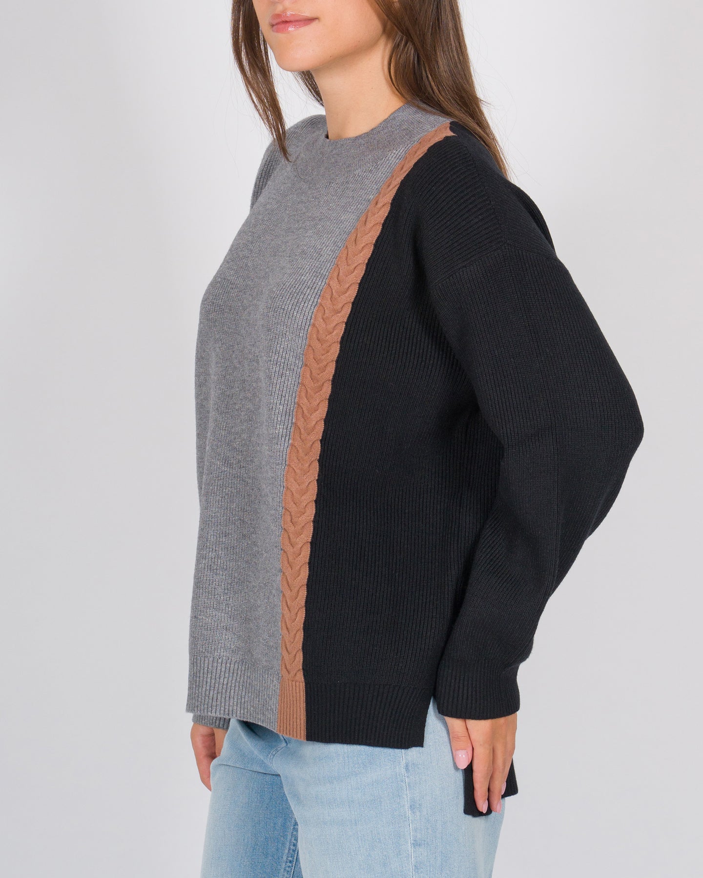 Questa maglia over in lana è realizzata con una lavorazione a costine che ne esalta la texture morbida e avvolgente. Il design è caratterizzato da un effetto tricolore nelle tonalità grigio, fango e nero che dona dinamismo e contemporaneità al modello. Le maniche lunghe raglan aggiungono comfort e una linea rilassata, perfetta per uno stile moderno e versatile.