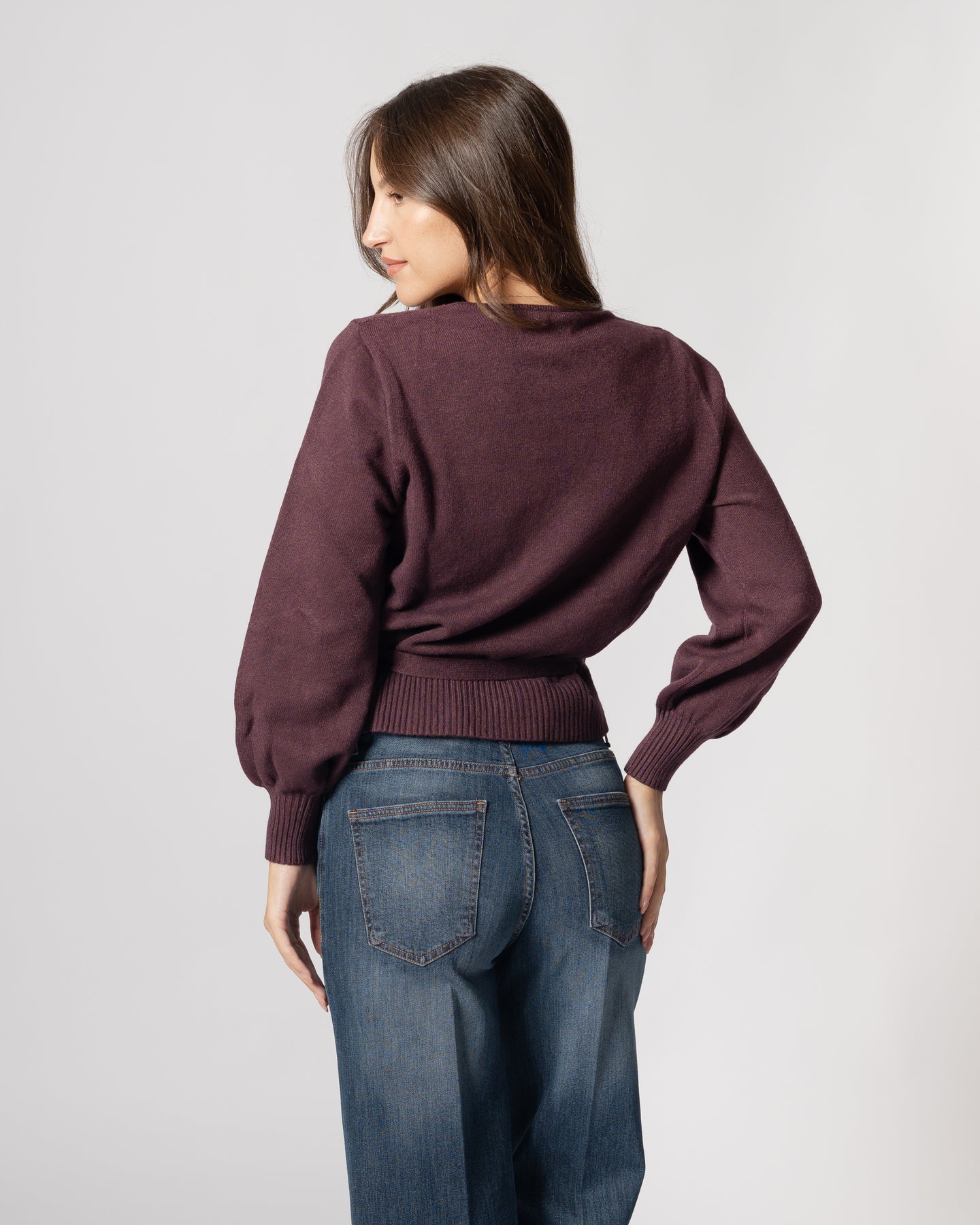 Maglia manica lunga incrociata in tessuto viscosa colore prugna.