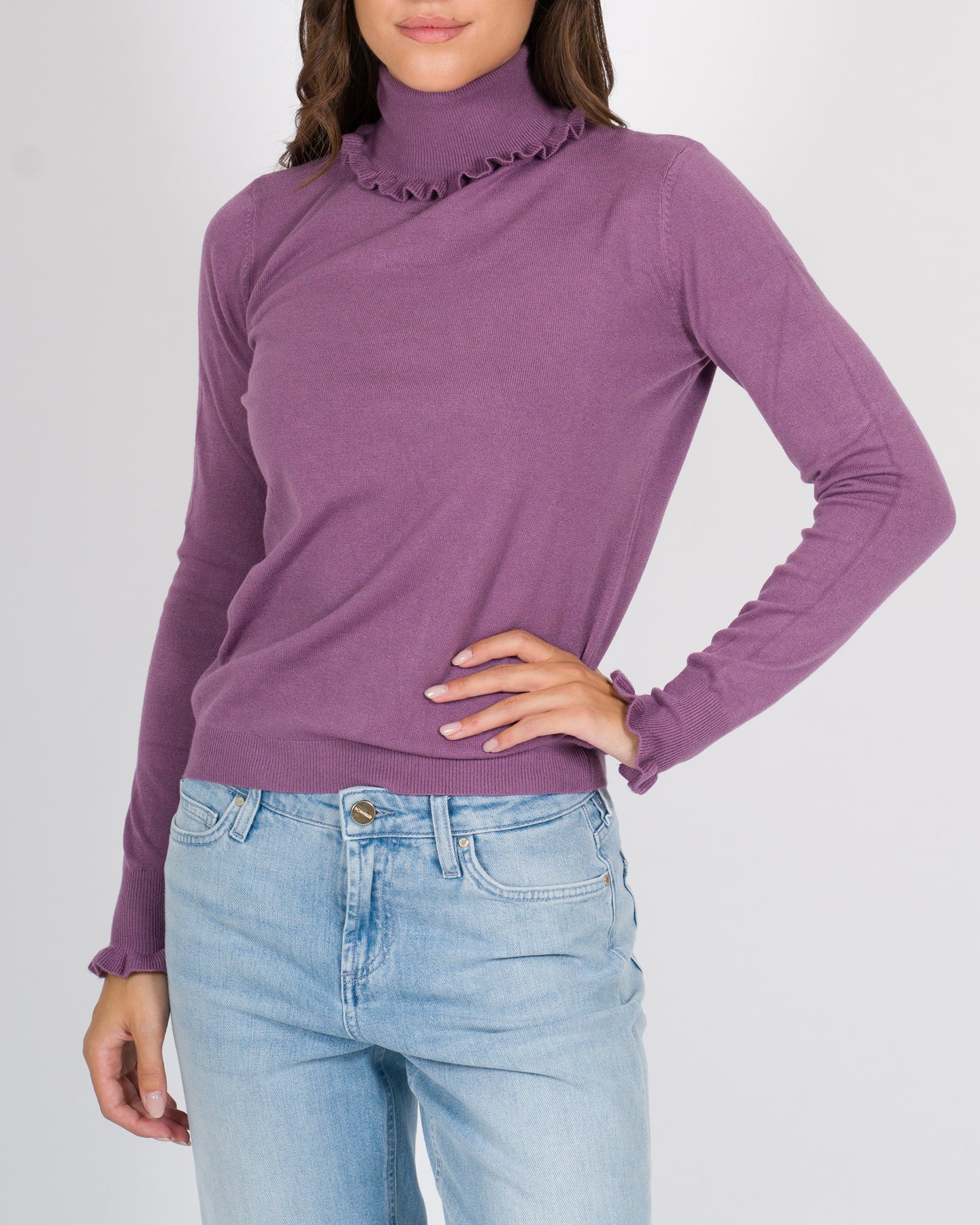 Elegante e femminile, questo pullover colo alto è realizzato in morbida viscosa elasticizzata, perfetta per accompagnare forme con leggerezza e confort. La sua linea essenziale è impreziosita da un raffinato dettaglio smerlato sul bordo del collo e dei polsi, che dona un tocco delicato e ricercato, ideale sia per il giorno che per la sera.Dettagli tecnici:Carattere: elegante, raffinatoTessuto: ViscosaVestibilità: regolareColore: melanzanaLa modella indossa la taglia S/M ed è alta 1.70.