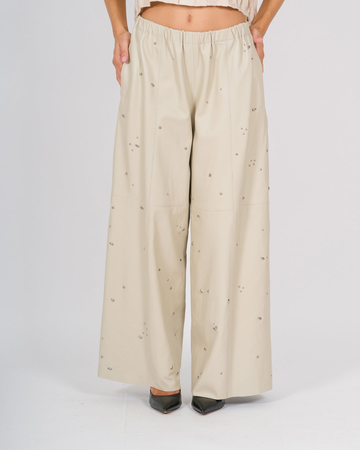 Pantalone Alysi in tessuto ecopelle colore panna, caratterizzato da vita elasticizzata per un comfort ottimale e una vestibilità versatile. Il design dritto e leggermente morbido valorizza la silhouette, mentre le cuciture curate conferiscono un aspetto raffinato.Dettagli del capo:Cabochon decorativi lungo la linea dei fianchi, per un tocco sofisticato e distintivoTasche laterali funzionali e discreteOrlo pulito e rifinito per un look eleganteTessuto ecopelle morbido e leggermente lucido, che combina stile e praticitàPerfetto per creare outfit chic e contemporanei, dal daywear al look serale, abbinabile sia a capi casual che a blazer o camicie più sofisticate.