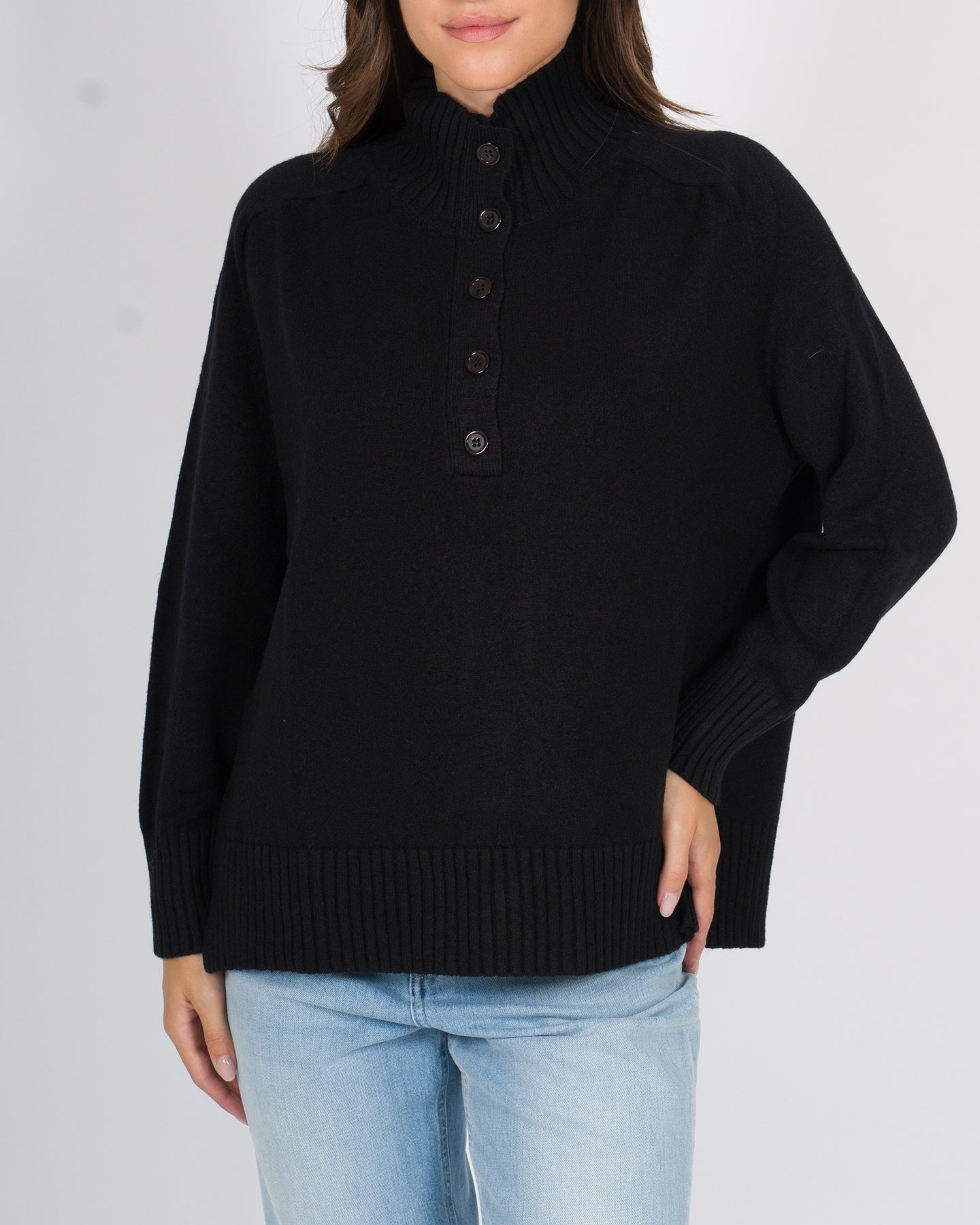 Maglia elegante e versatile realizzata in morbido tessuto di viscosa, perfetta per un look curato e confortevole. Il modello presenta maniche lunghe e un raffinato collo pistagna a coste, che dona un tocco moderno e strutturato al capo. La chiusura con cinque bottoni sul davanti aggiunge un dettaglio distintivo e permette di regolare l'apertura secondo il proprio stile. Il design essenziale ma ricercato rende questa maglia ideale sia per contesti casual che più formali.Dettagli tecnici:Chiusura 5 bottoniTessuto: viscosaColore: neroLa modella indossa la taglia S/M ed è alta 1.70
