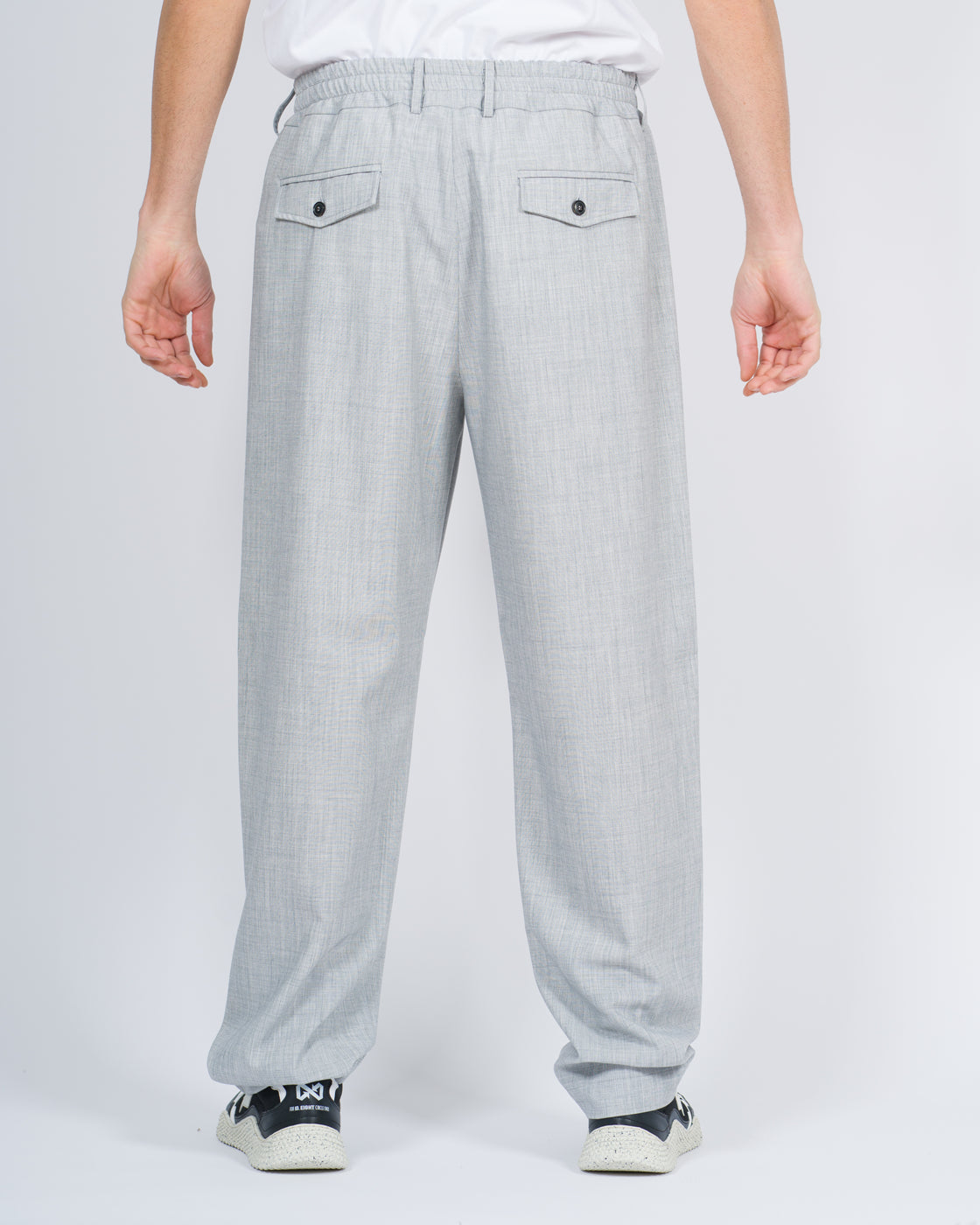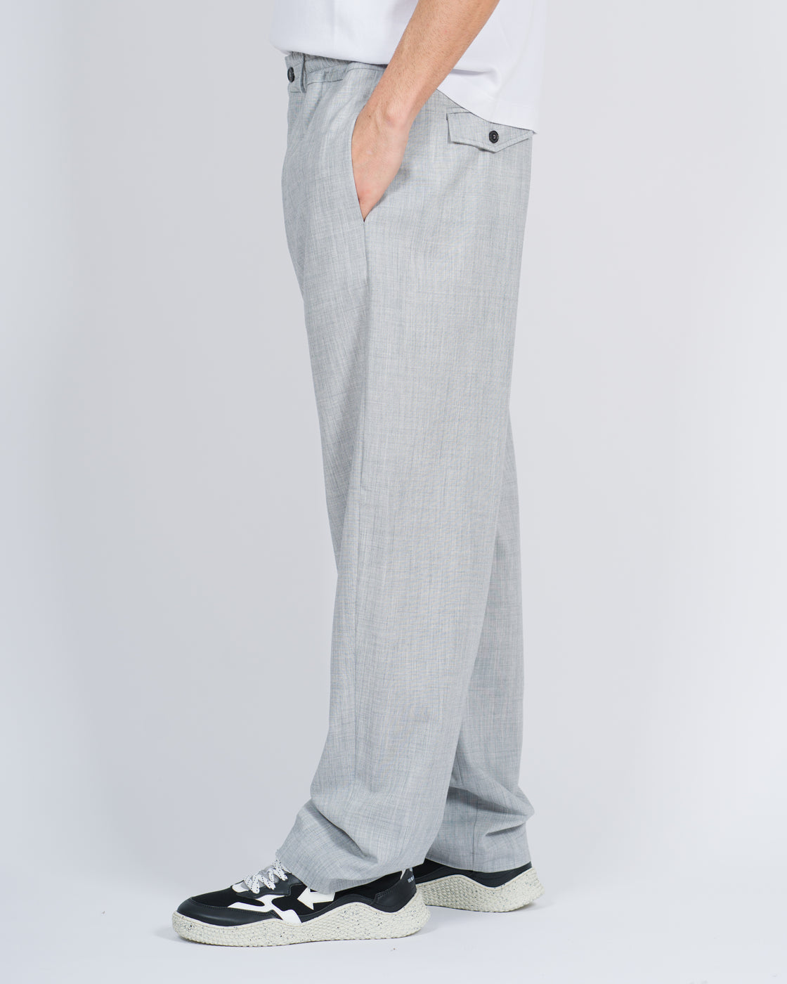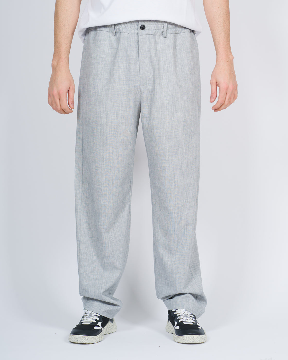 Pantalone con elastico in vita in tessuto cadente misto lana fiammata.Il modello è alto 1,90 e indossa la taglia 48.Possibile abbinare con la camicia dello stesso tessuto per completare look.