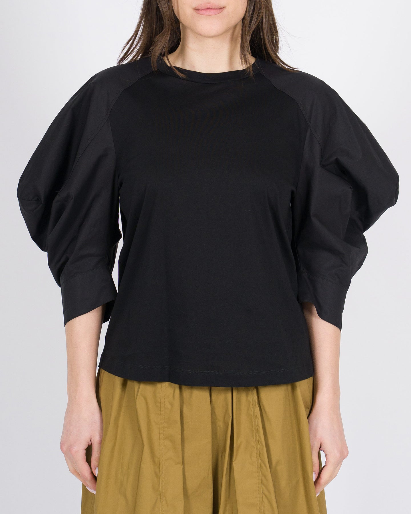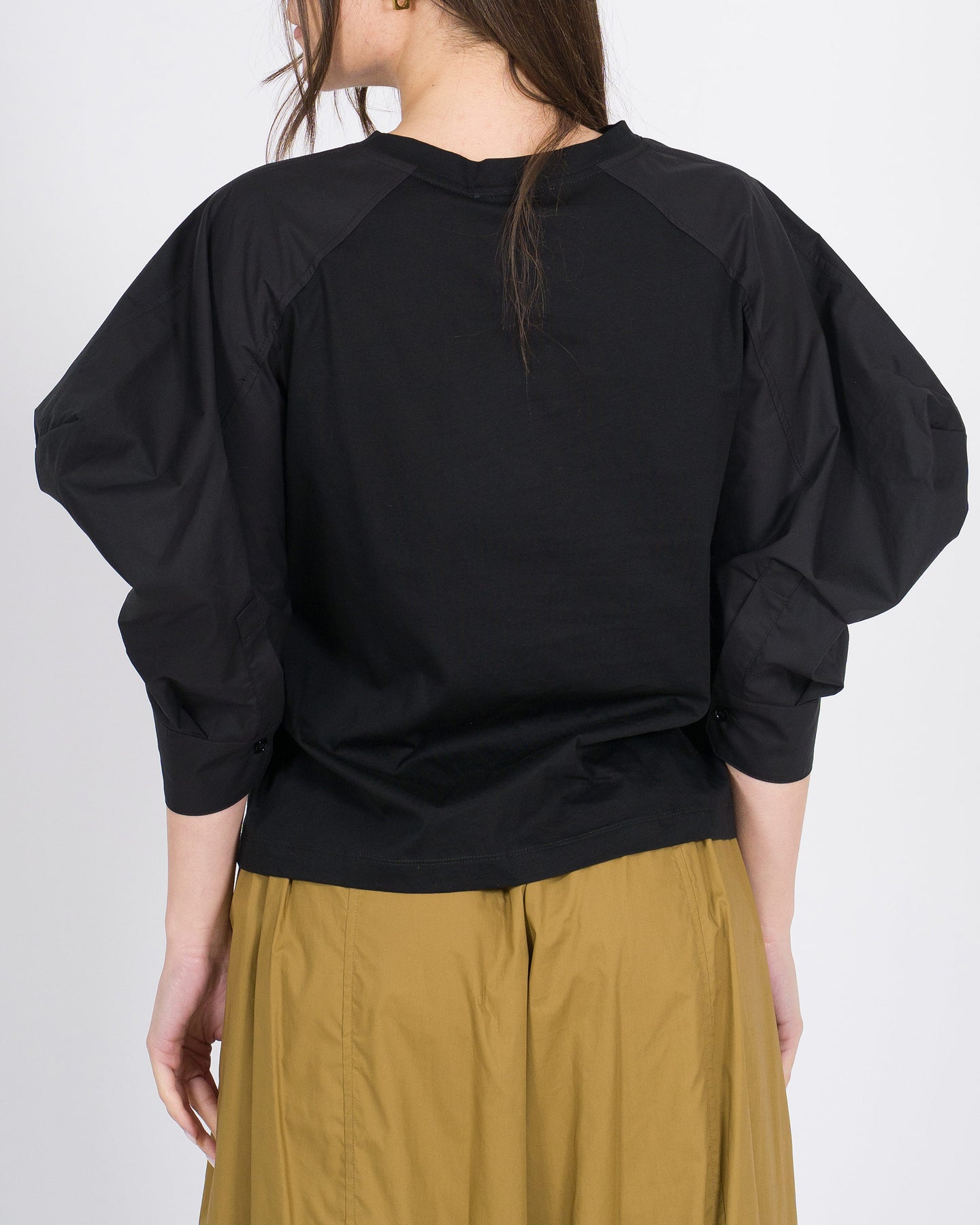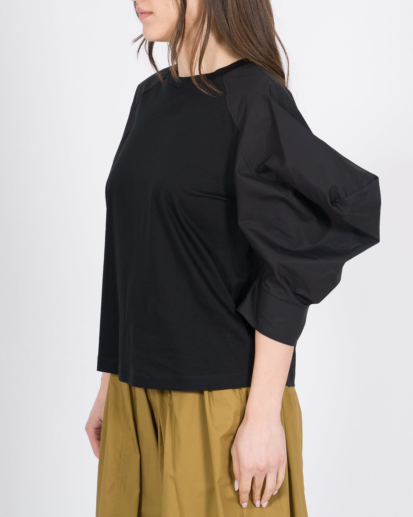 Linee morbide, dettaglio femminile, stile contemporaneo.La t-shirt MEIMEJ in cotone con maniche a sbuffo avvolge la silhouette con comfort, combinando morbidezza e design raffinato per un look minimal e sofisticato.Un capo versatile, perfetto da abbinare a pantaloni larghi, gonne o bermuda per outfit eleganti e ricercati.