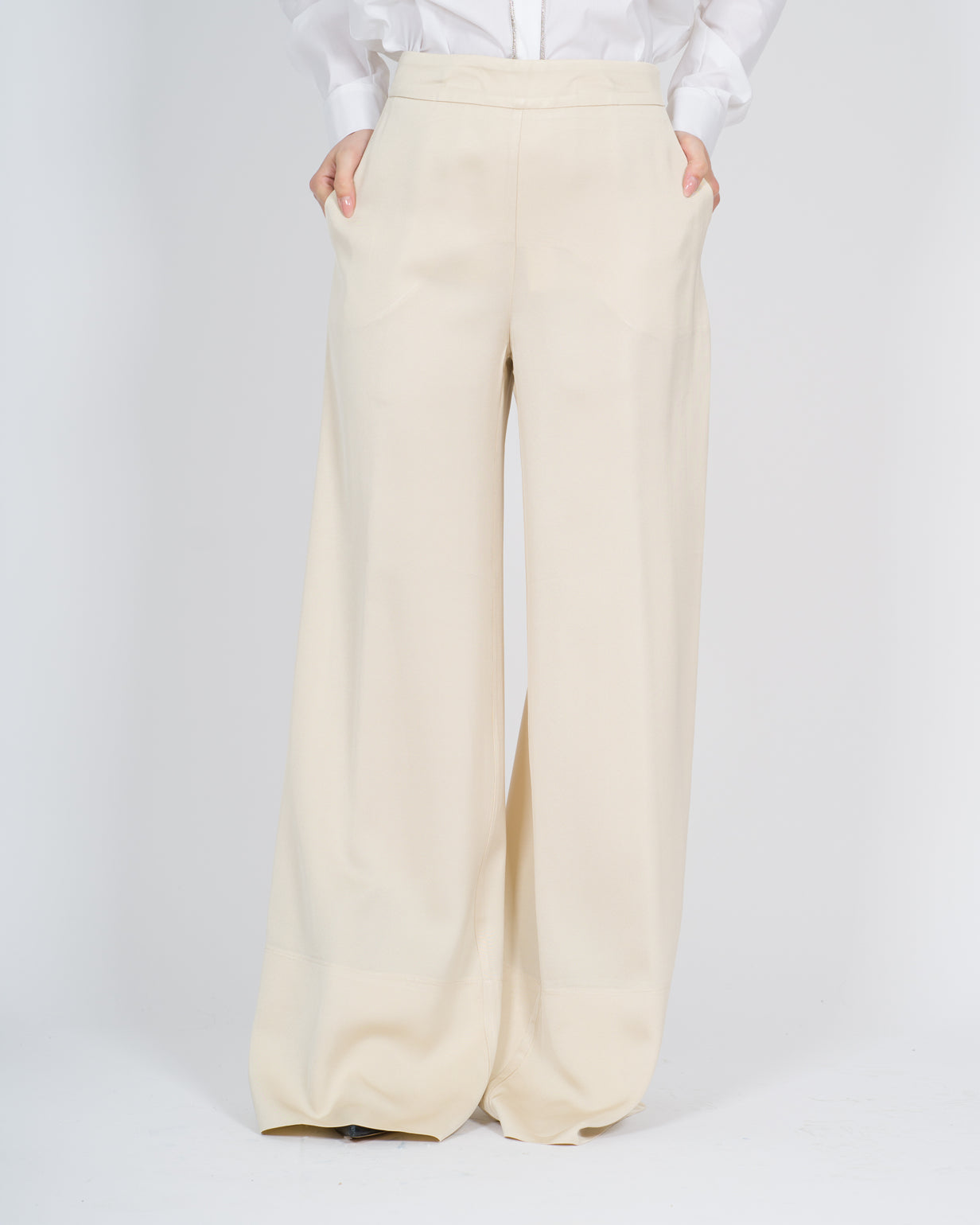 Pantaloni in raso a gamba larga con cuciture decorative e tasche laterali. Sono una scelta irrinunciabile che completa qualsiasi look per le occasioni speciali.