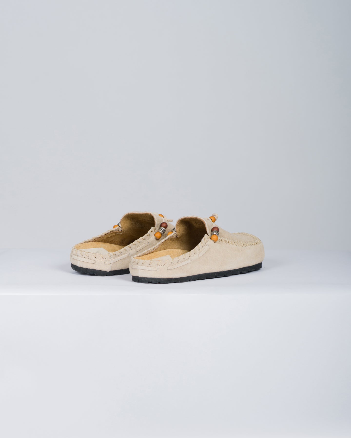 Sabot con suola anatomica, tomaia in suede grezzo e laccio in pelle con perline, fodera in vitello.