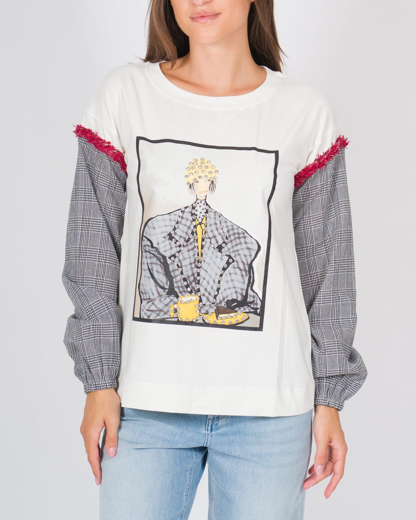 Una rilettura contemporanea della classica T-shirt a maniche lunghe. Il modello combina il comfort del cotone per la parte principale con una manica in tessuto di lana a quadretti, creando un interessante gioco di contrasti. La stampa centrale è arricchita da ricami rossi che aggiungono un tocco artigianale e distintivo. Un capo originale e versatile, perfetto per dare personalità a un look casual.Dettagli:Tessuto principale: cotoneManica in lana a quadrettiColore base: biancoStampa centrale con dettagli ricamati in rossoGirocolloStruttura ibrida: mezza manica in cotone + manica lunga in lanaVestibilità regolare