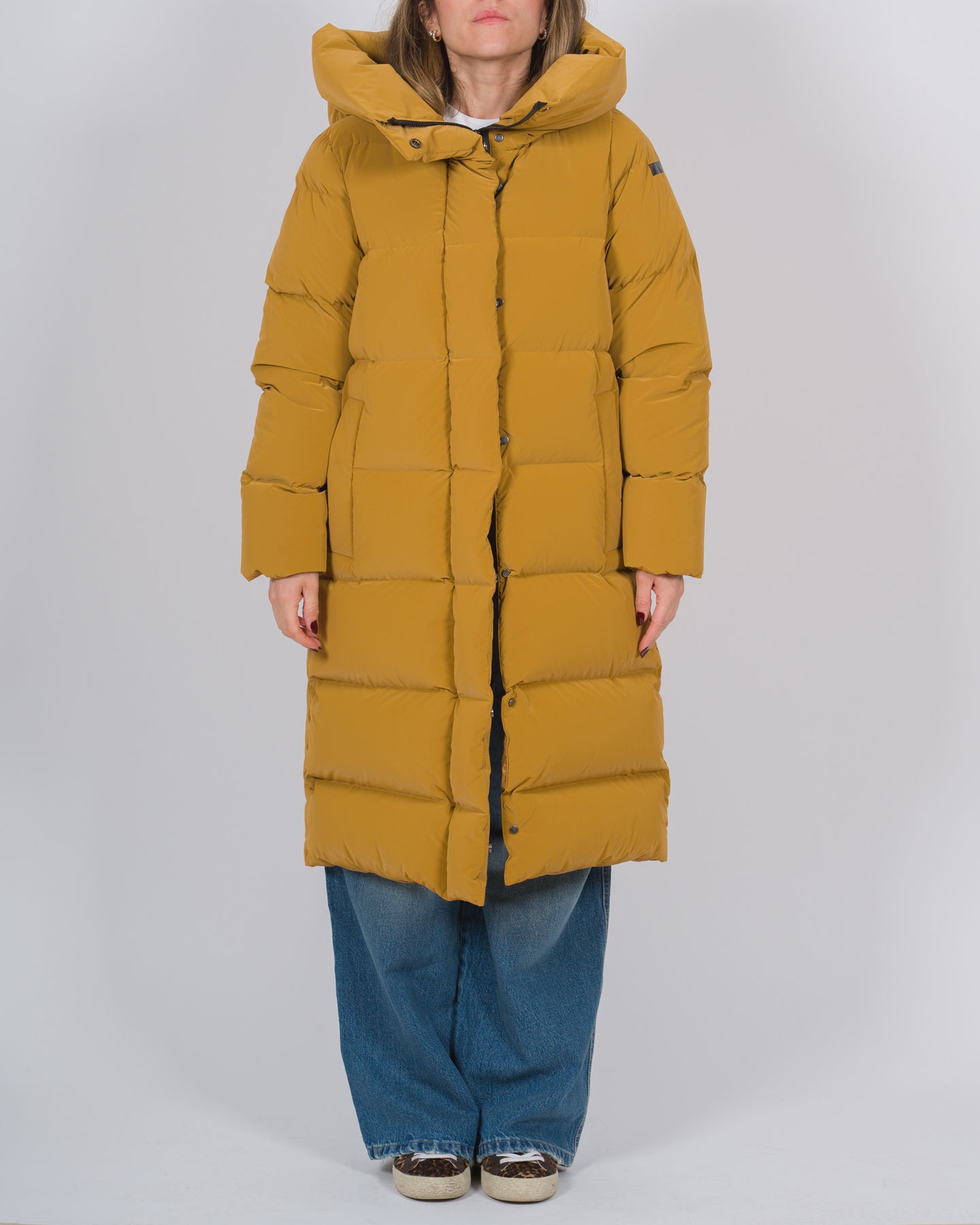 Il parka svela il volto più chic ed elegante in questa reinterpretazione dal touch estremamente morbido e dal look delicatamente cangiante. La sua linea, valorizzata dall'importante cappuccio staccabile che avvolge il viso, lo rende particolarmente protettivo anche nel clima invernale più rigido. Il capospalla si caratterizza per la texture nitida e ininterrotta degli ampi canali tubici, che racchiudono il calore dell'imbottitura in piuma d'anatra 90/10, particolarmente soffice e dall'elevato comfort. La zip termonastrata sul davanti è nascosta dalla pattina, che caratterizza il design minimalista del parka in tutta la sua lunghezza. Le discrete tasche a pistagna e il logo a microiniezione sulla manica sinistra completano il capo con ulteriori note di stile esclusivo.