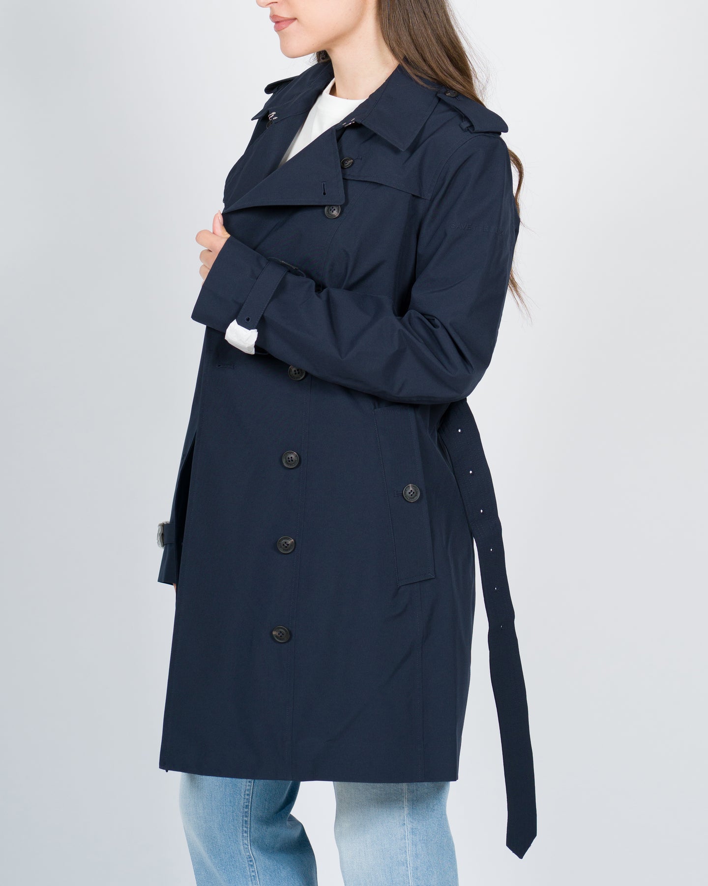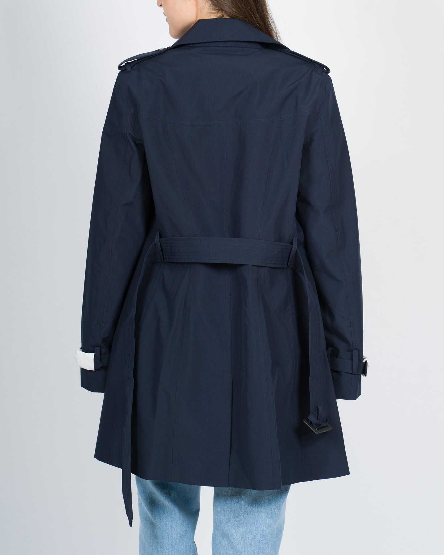 Realizzato in leggero poliestere riciclato da bottiglie di plastica il trench slim fit Audrey offre protezione da pioggia e vento grazie al tessuto tecnico e alle cuciture termonastrate. Non mancano i dettagli del classico modello all'inglese come la chiusura doppiopetto la cintura impunturata in vita e i cinturini regolabili ai polsi. Il logo inciso sui bottoni gommati e il badge incollato a caldo sulla manica sinistra.