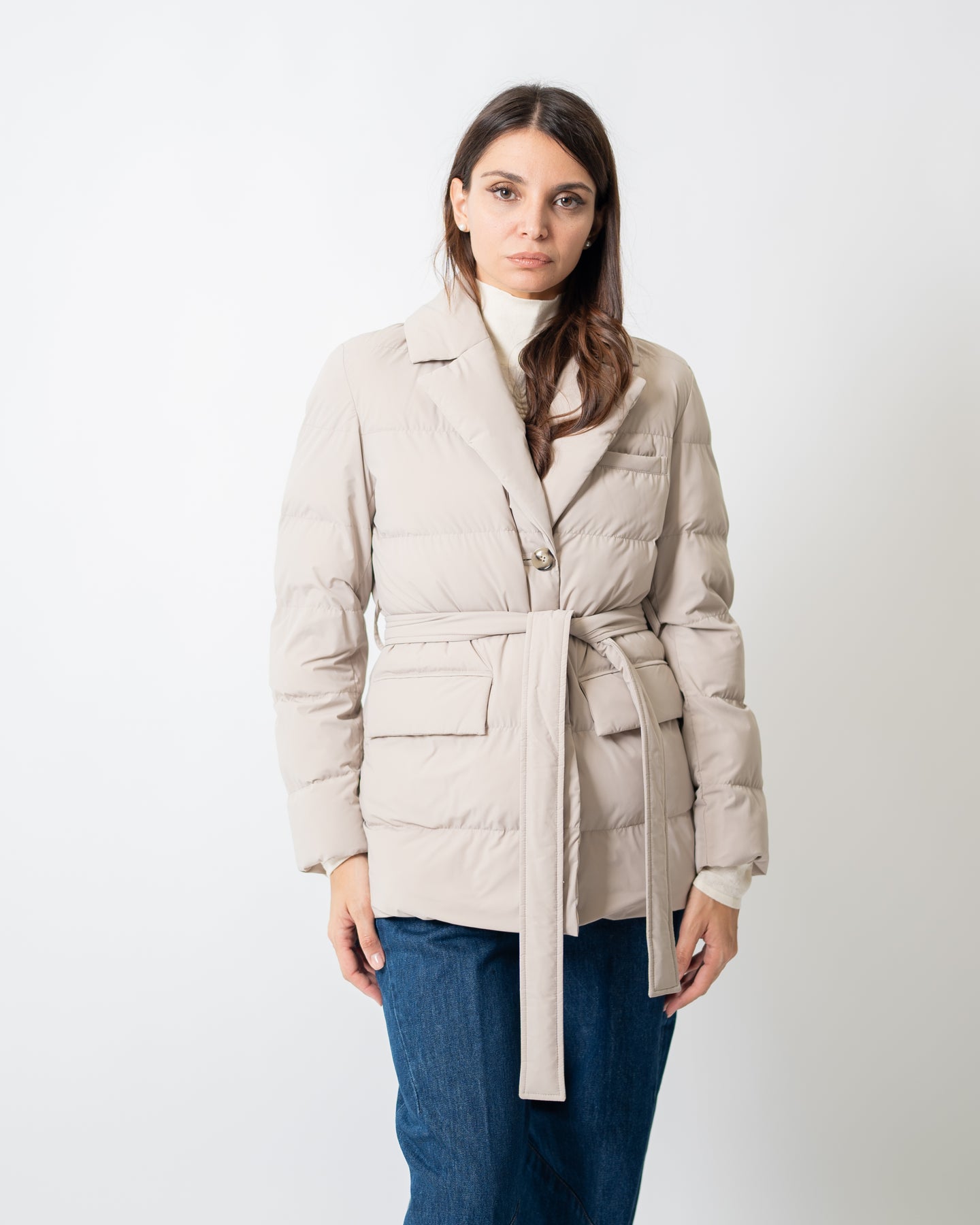 Giubbino corto con cintura in vita realizzato in nylon opaco stretch. Collo a rever, chiusura frontale con tre bottoni e cintura in vita. Tasche con patta sui fianchi.