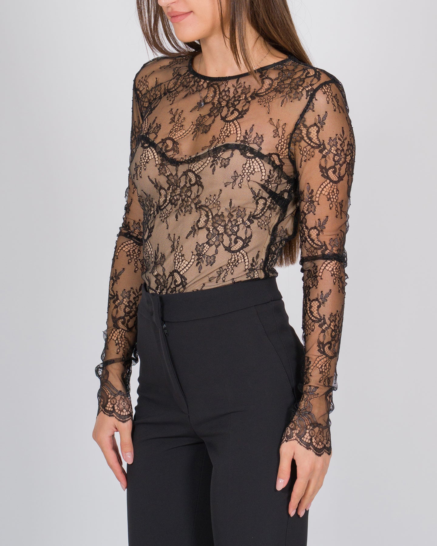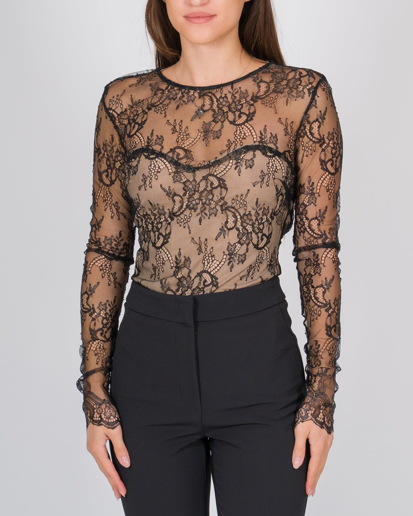 Body in pizzo nero con scollatura posteriore, femminile e sensuale. Un capo elegante ideale per look raffinati e serate speciali.