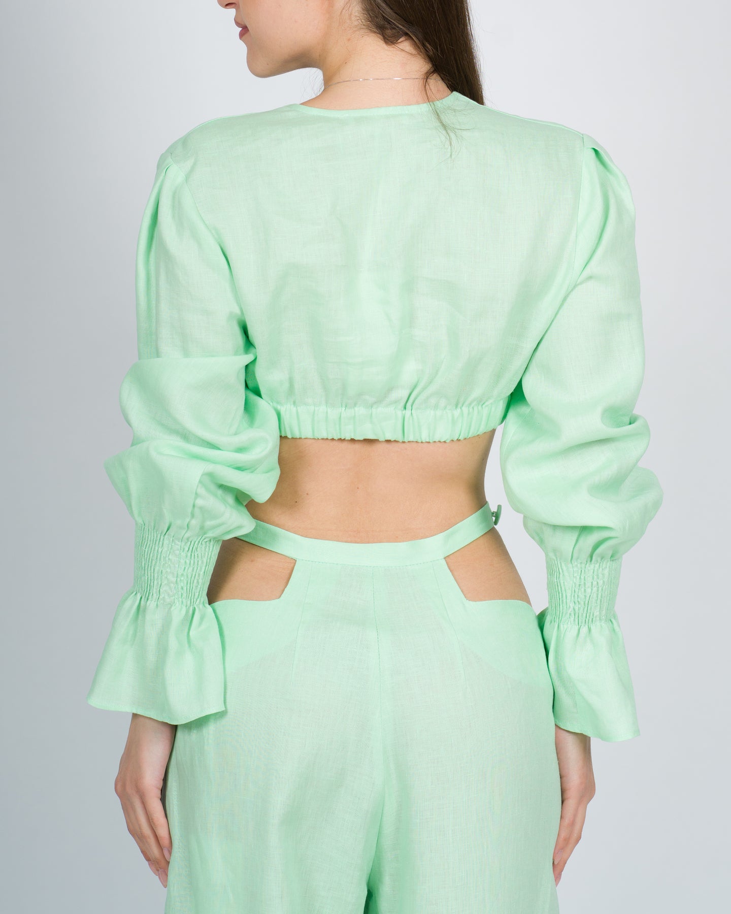 Il top in 100% lino della collezione primavera/estate di Silence Limited è caratterizzato dal design cropped e presenta ampio scollo a V con manica a palloncino con volant. Elastico sul retro.Perfetto per le giornate di sole, questo top con il suo pantalone abbinato unisce comfort e freschezza con un tocco di stile.Questo prodotto veste regolare.
