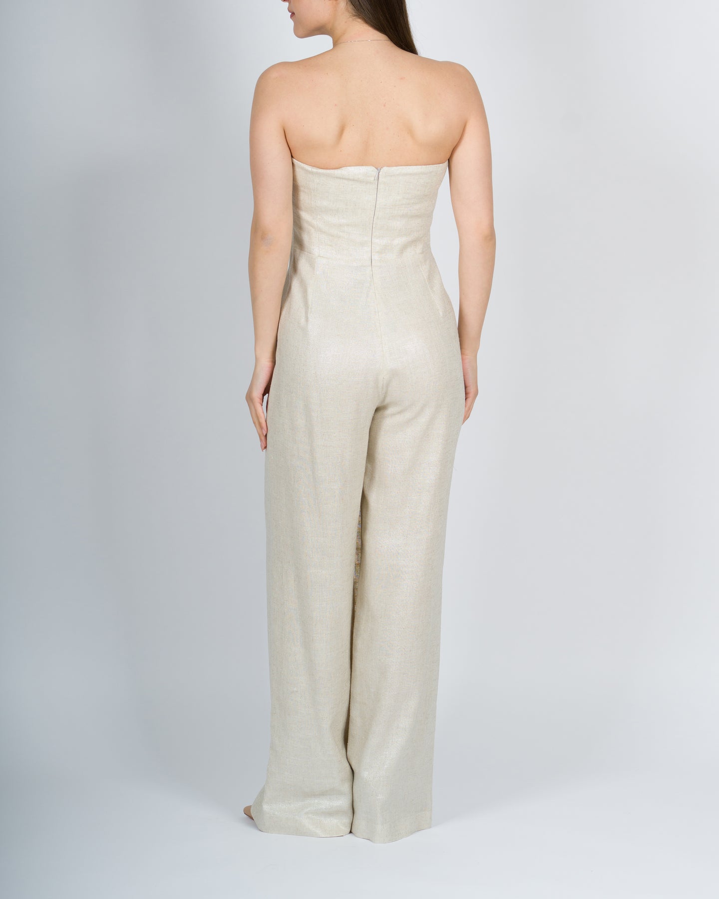 Tuta strapless Silence Limited, colore beige chiaro, modello senza spalline, tessuto effetto lino, gamba ampia, dettaglio doppiopetto con bottoni, tasche laterali, finte tasche frontali a filetto, chiusura posteriore con zip. La modella indossa la taglia XS ed è alta 170cm.Composizione: 80%Ray, 20%Lino