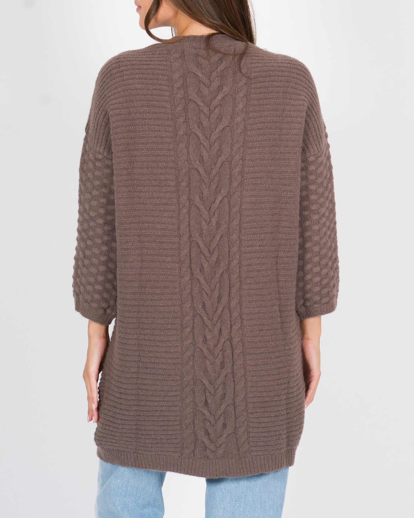 Cardigan lungo senza bottoni, realizzato in morbido tessuto di viscosa con una raffinata lavorazione a trecce che dona texture e movimento al capo. Le maniche raglan assicurano una vestibilità comoda e fluida, mentre il taglio regular lo rende versatile e adatto a diverse silhouette.Perfetto da indossare aperto su top e camicie, è un capo passe-partout ideale per completare il look con eleganza.Dettagli tecnici:Tessuto: viscosaLavorazione trecce Colore: cacaoLa modella indossa la taglia S/M ed è alta 1.70