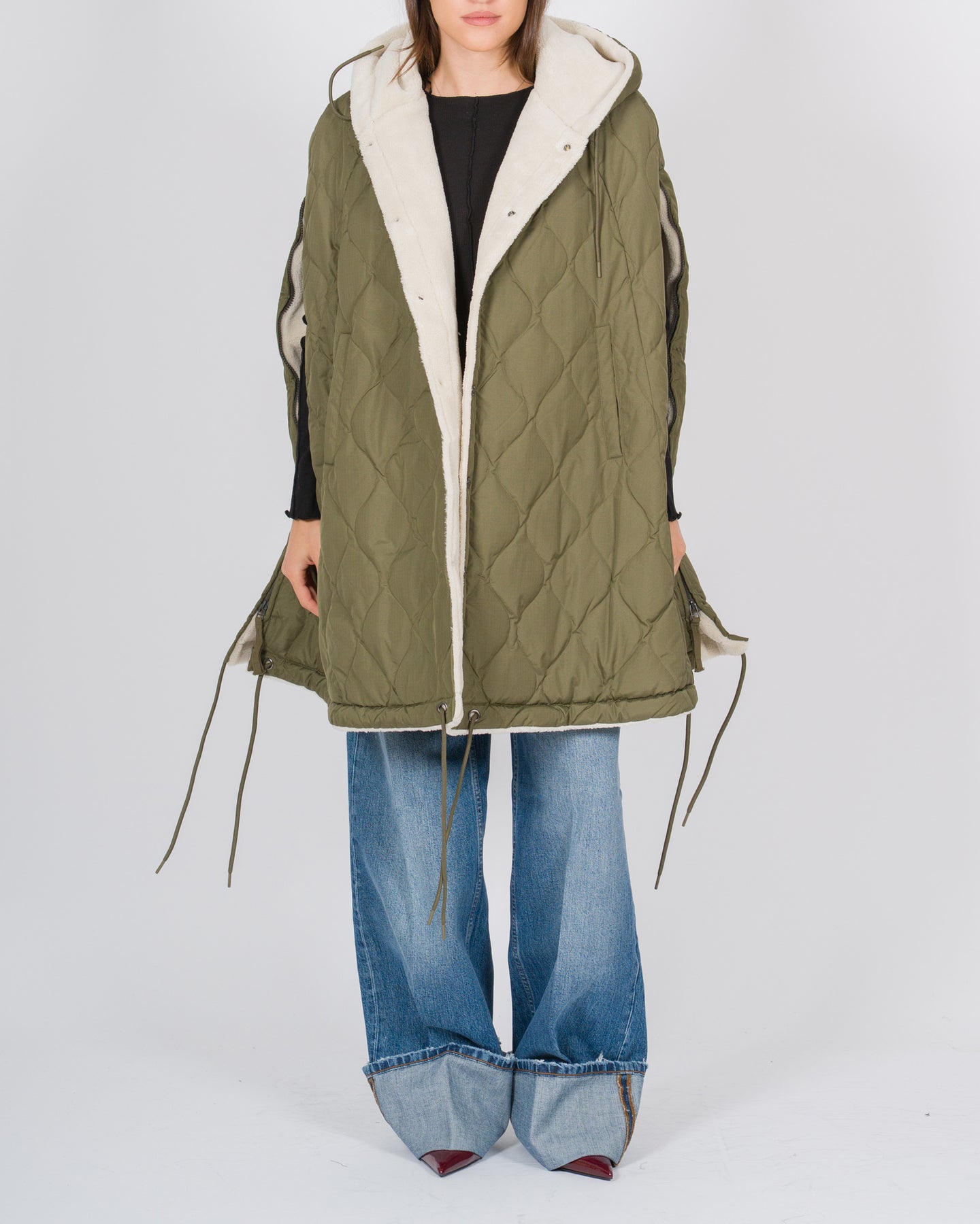 La mantella trapuntata reversibile firmata Taion combina funzionalità, comfort e stile contemporaneo.Realizzata con tecnologia high-tech Taion, il capo offre un design senza maniche, ideale per stratificazioni leggere e versatili durante la stagione fredda.Il lato esterno presenta un tessuto tecnico trapuntato, mentre l'interno è foderato in morbido orsetto panna, per una sensazione calda e avvolgente a contatto con la pelle.Il cappuccio con stringhe regolabili permette di adattare la vestibilità alle esigenze climatiche, mentre il taglio ampio e il design a mantella garantiscono libertà di movimento e un look contemporaneo e urbano.La reversibilità consente di cambiare facilmente l'estetica del capo: un lato tecnico e minimal, l'altro soffice e cozy, perfetto per affrontare i mesi più freddi con stile.Un capo Made in Corea, sinonimo di qualità, innovazione.