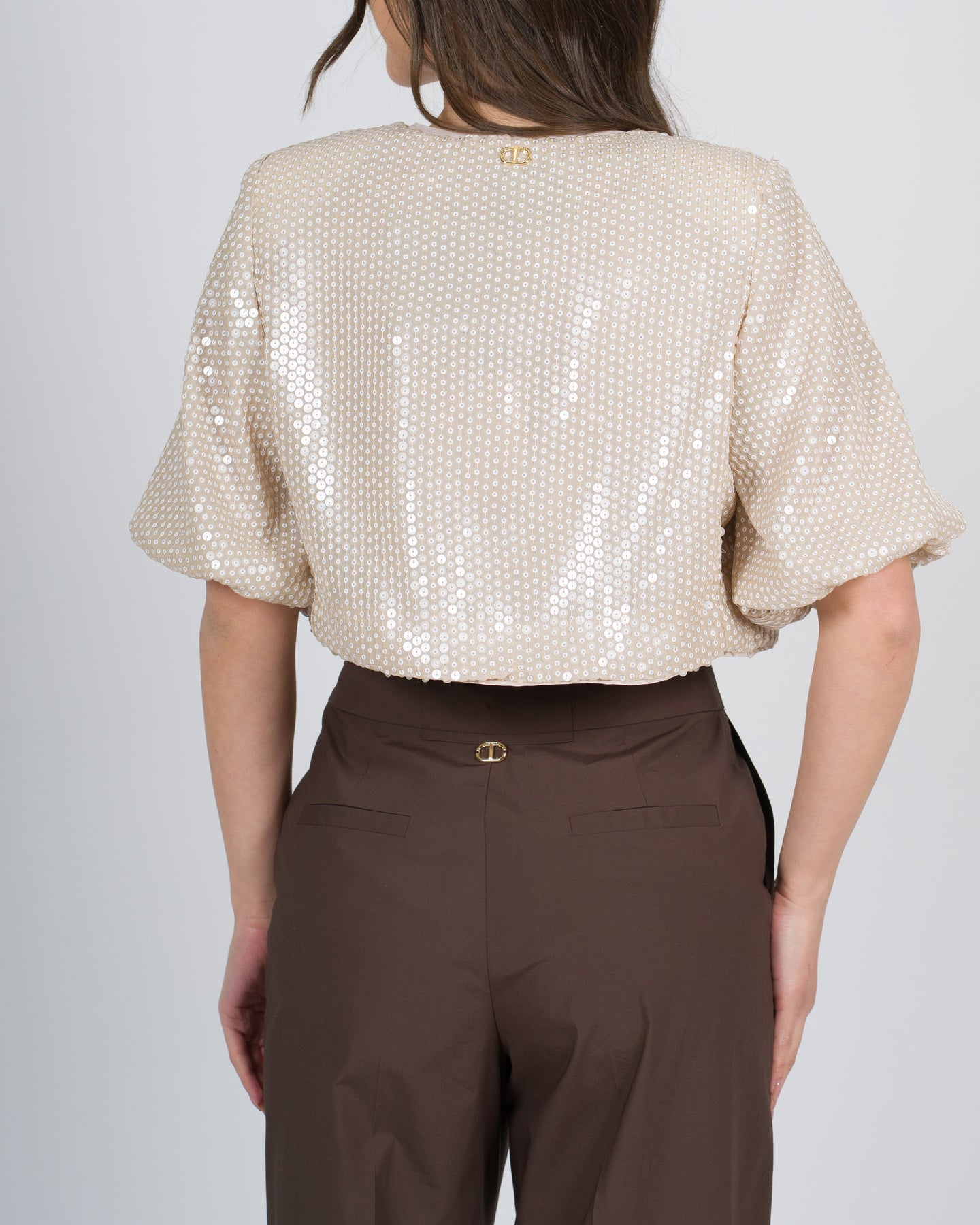 Coprispalle in tessuto ricamato da paillettes con chiusura combaciata allo scollo, maniche corte con rimborso al fondo, foderato, linea dritta. Perfetto per party e cerimonie.