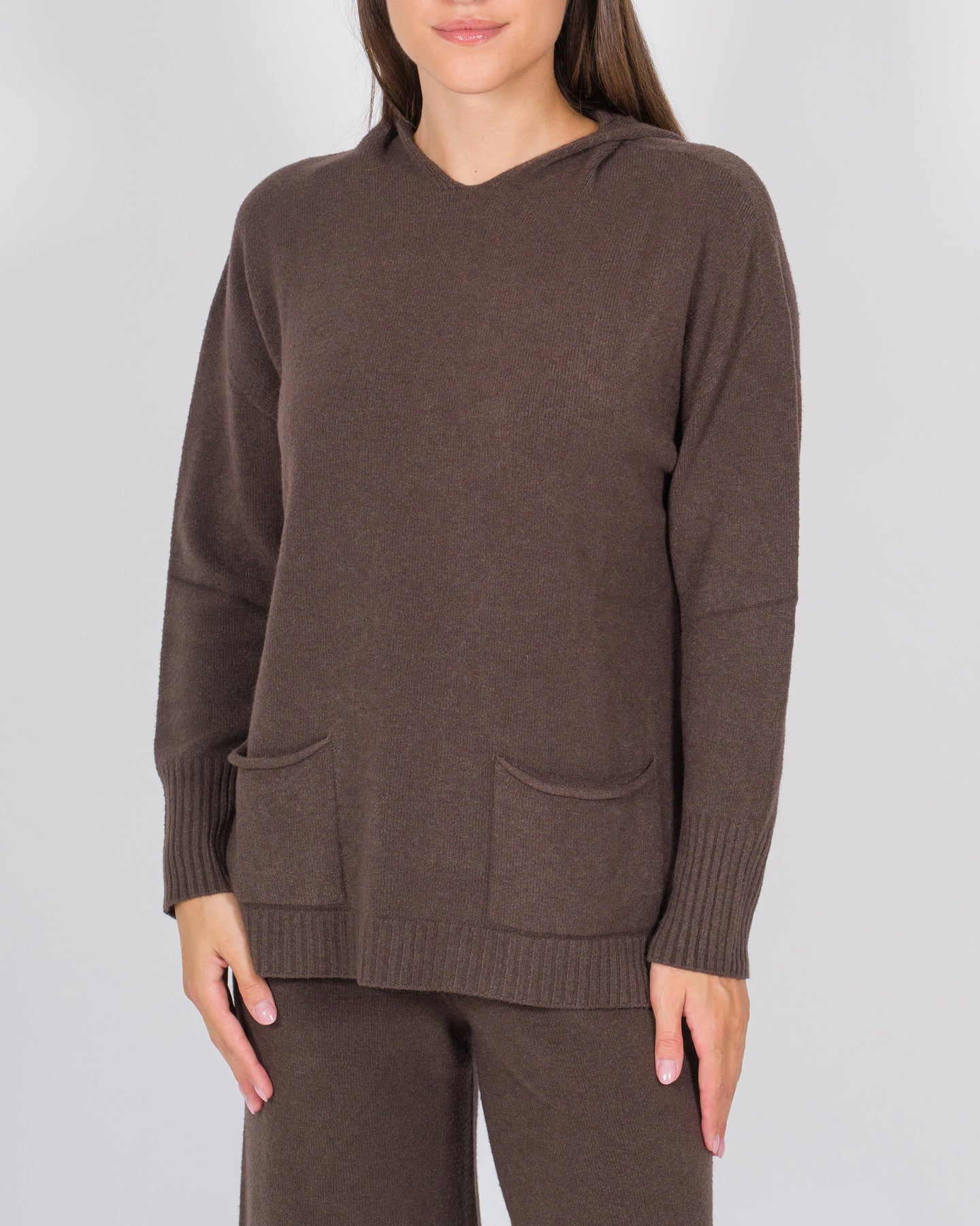 Felpa dallo stile casual e avvolgente, realizzata in morbida maglia di lana. Il design unisce comfort e praticità grazie al cappuccio ampio e ai tasconi applicati sul davanti. Perfetta per le giornate più fredde, è un capo versatile da indossare sia in casa che all'aperto, sopra jeans o pantaloni comodi.Dettagli tecnici:Vestibilità morbidaMaglia calda e traspiranteCappuccio Composizione: lana e viscosaColore: cacaoLa modella indossa la taglia S ed è alta 1.70